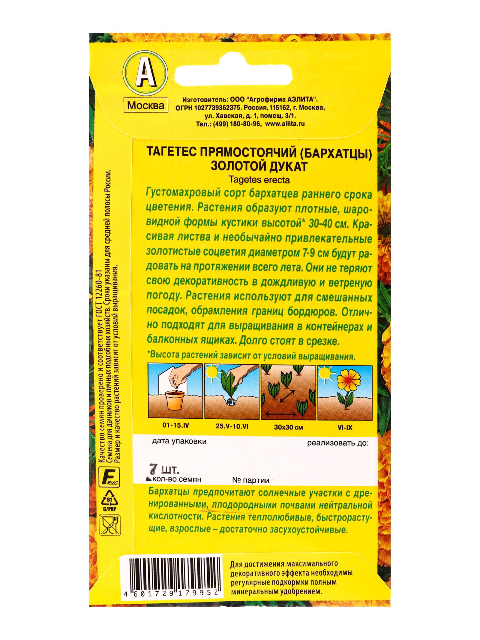 Семена цветов Бархатцы Золотой дукат прямостоячие, Ц/П,7 шт., Агрофирма АЭЛИТА, Россия
