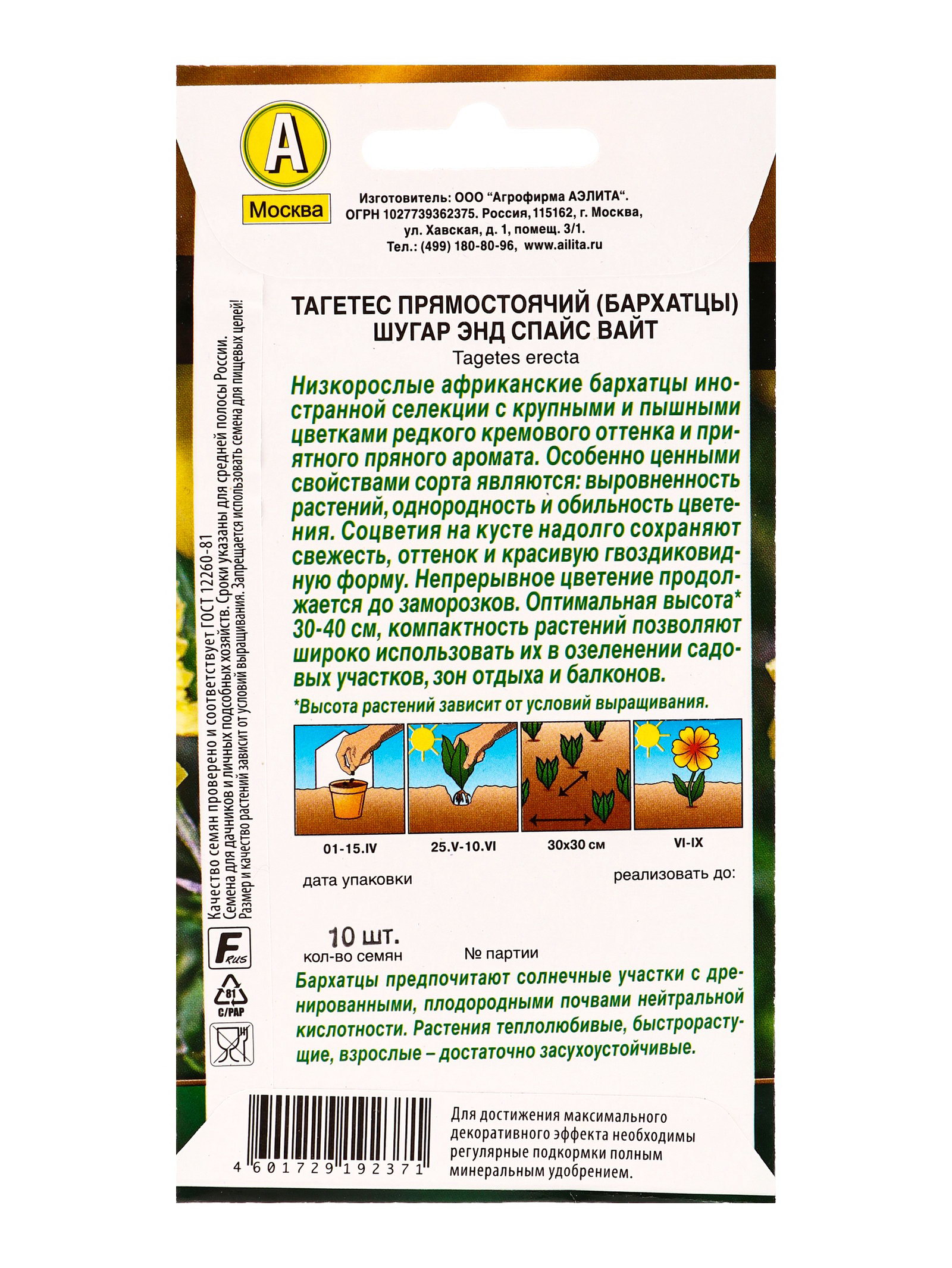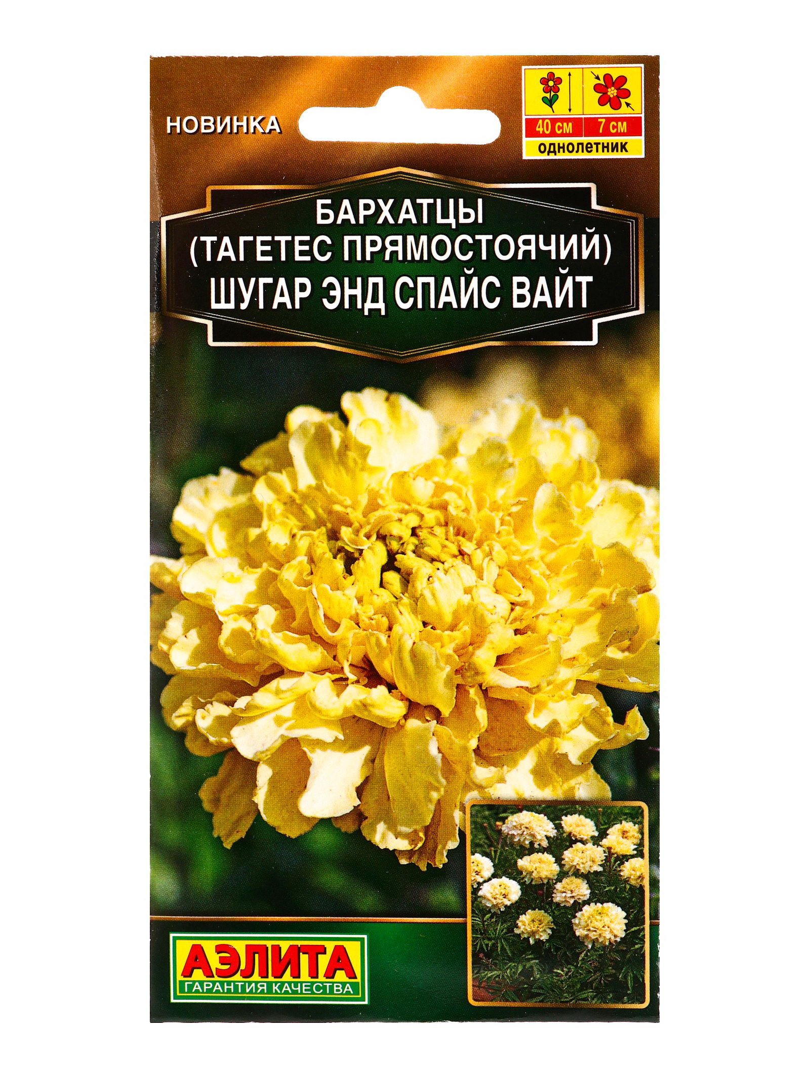 Семена цветов Бархатцы Шугар энд спайс вайт прямостоячие Золотая серия, Ц/П,10 шт., Агрофирма АЭЛИТА, Китай