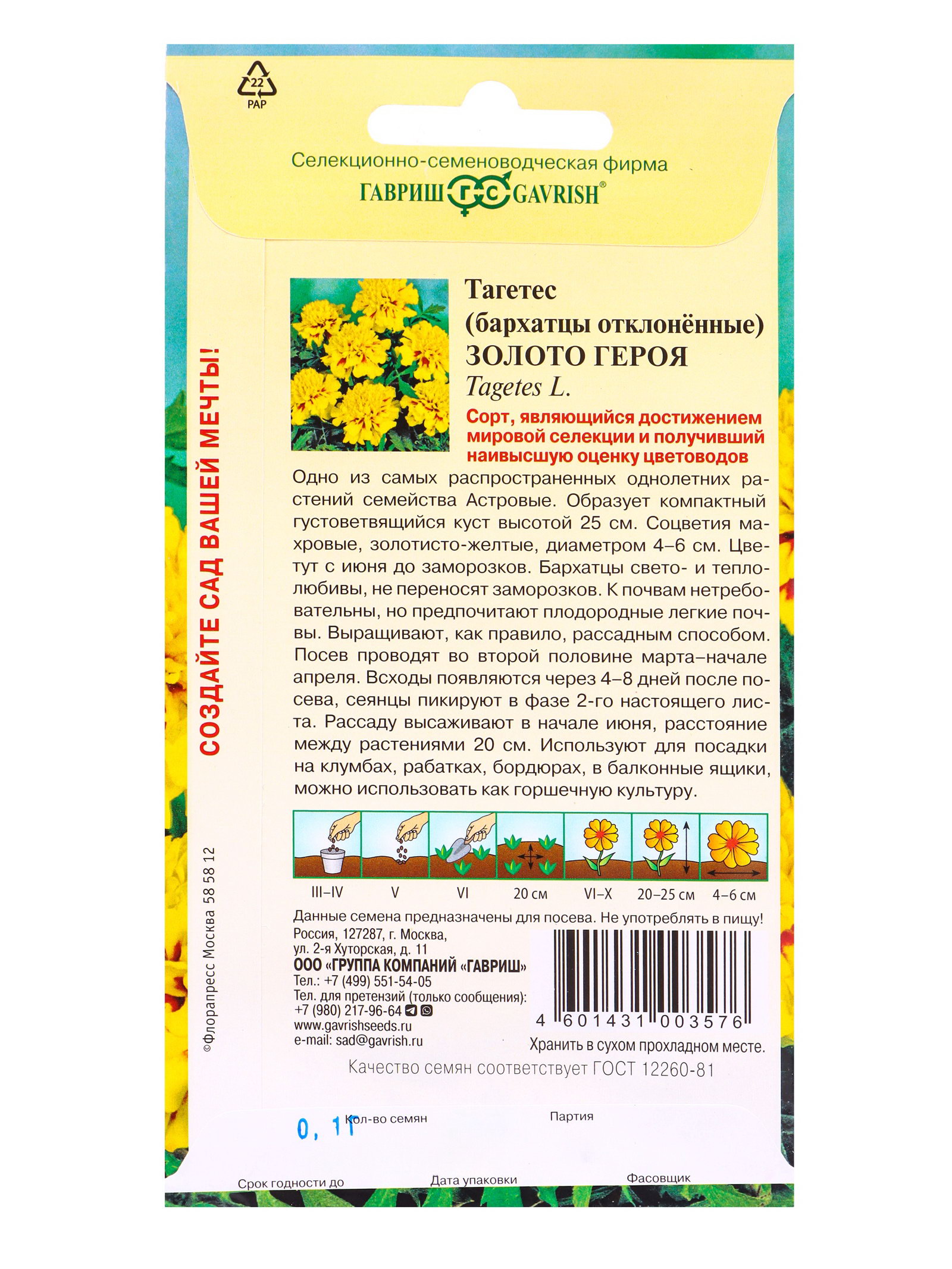 Семена цветов Бархатцы откл. Золото героя, Гавриш, Россия