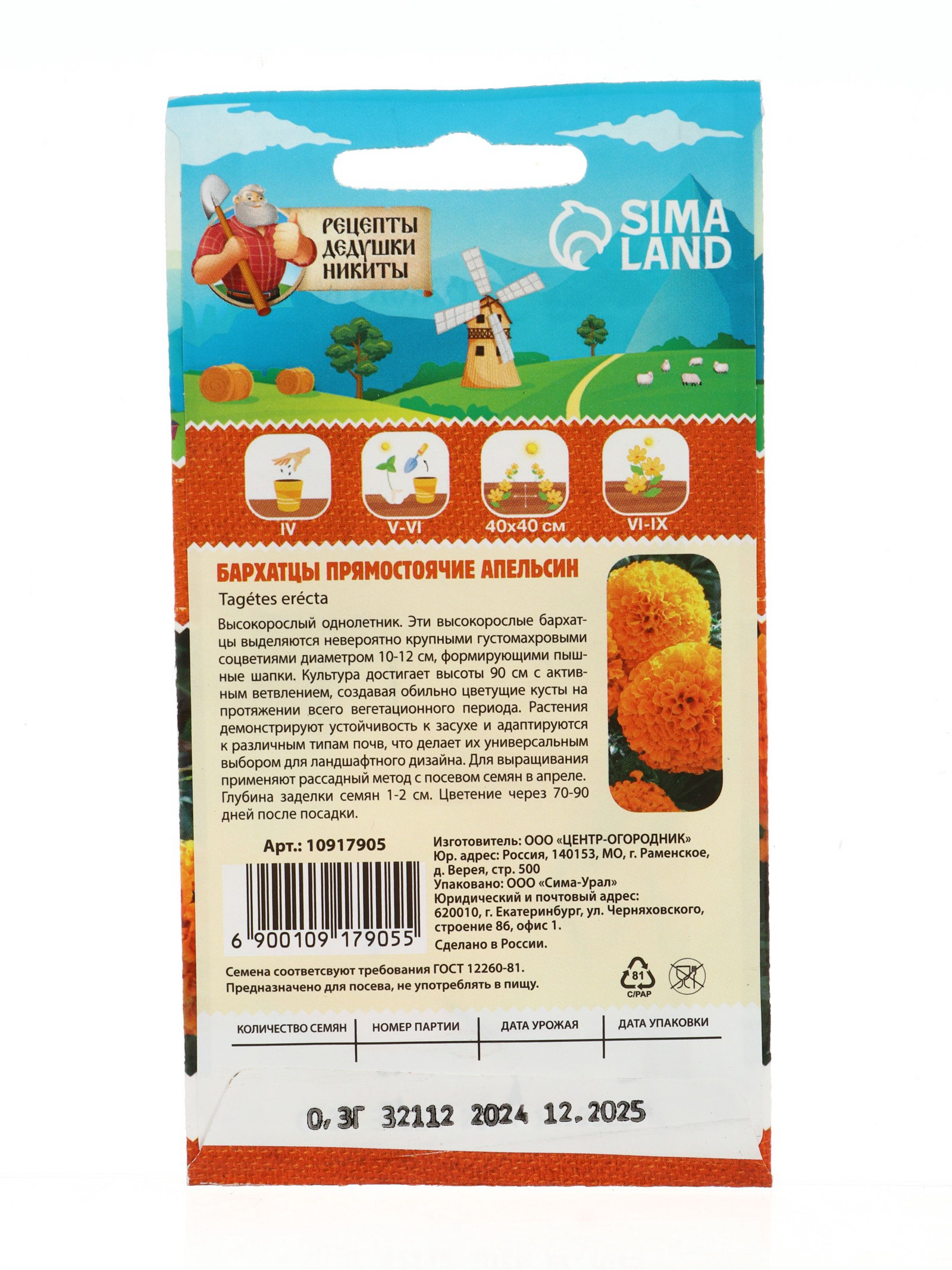 Семена цветов Бархатцы "Апельсин" прямостоячие, 0.3 г, 7x15x1 см., Рецепты дедушки Никиты, Россия