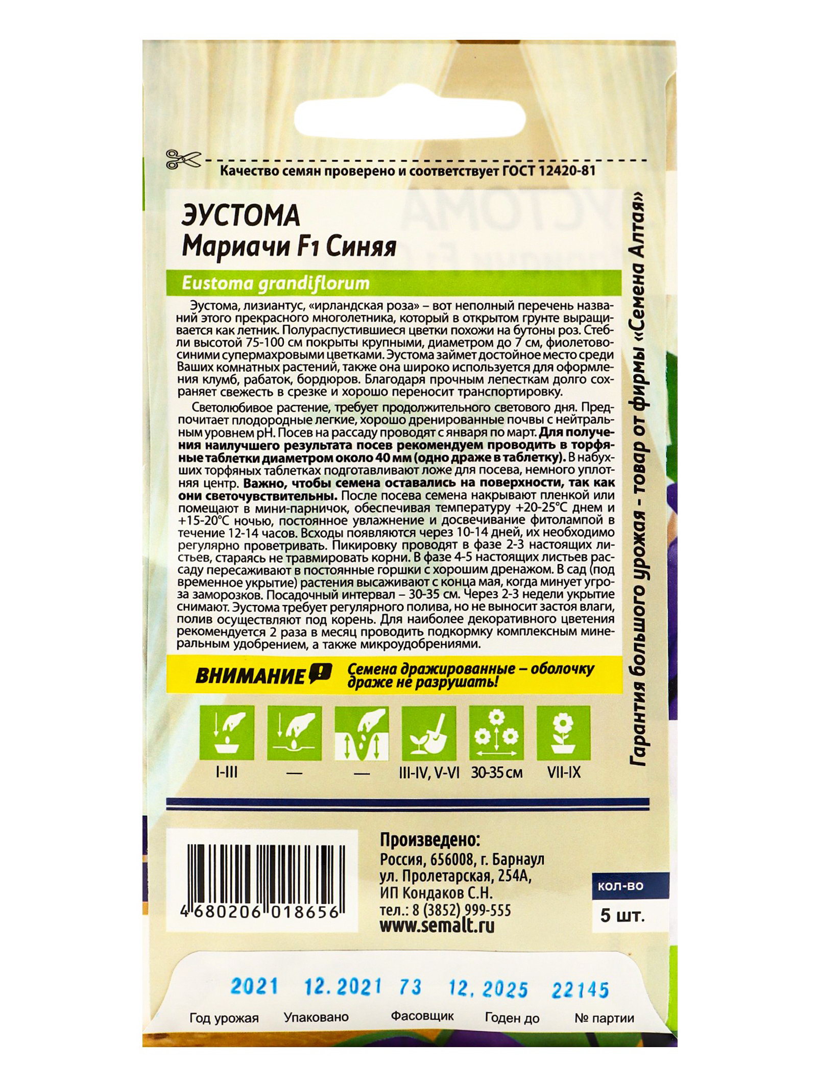 Семена цветов Эустома "Мариачи" Синяя, О, ц/п,5 шт., Семена Алтая, Россия