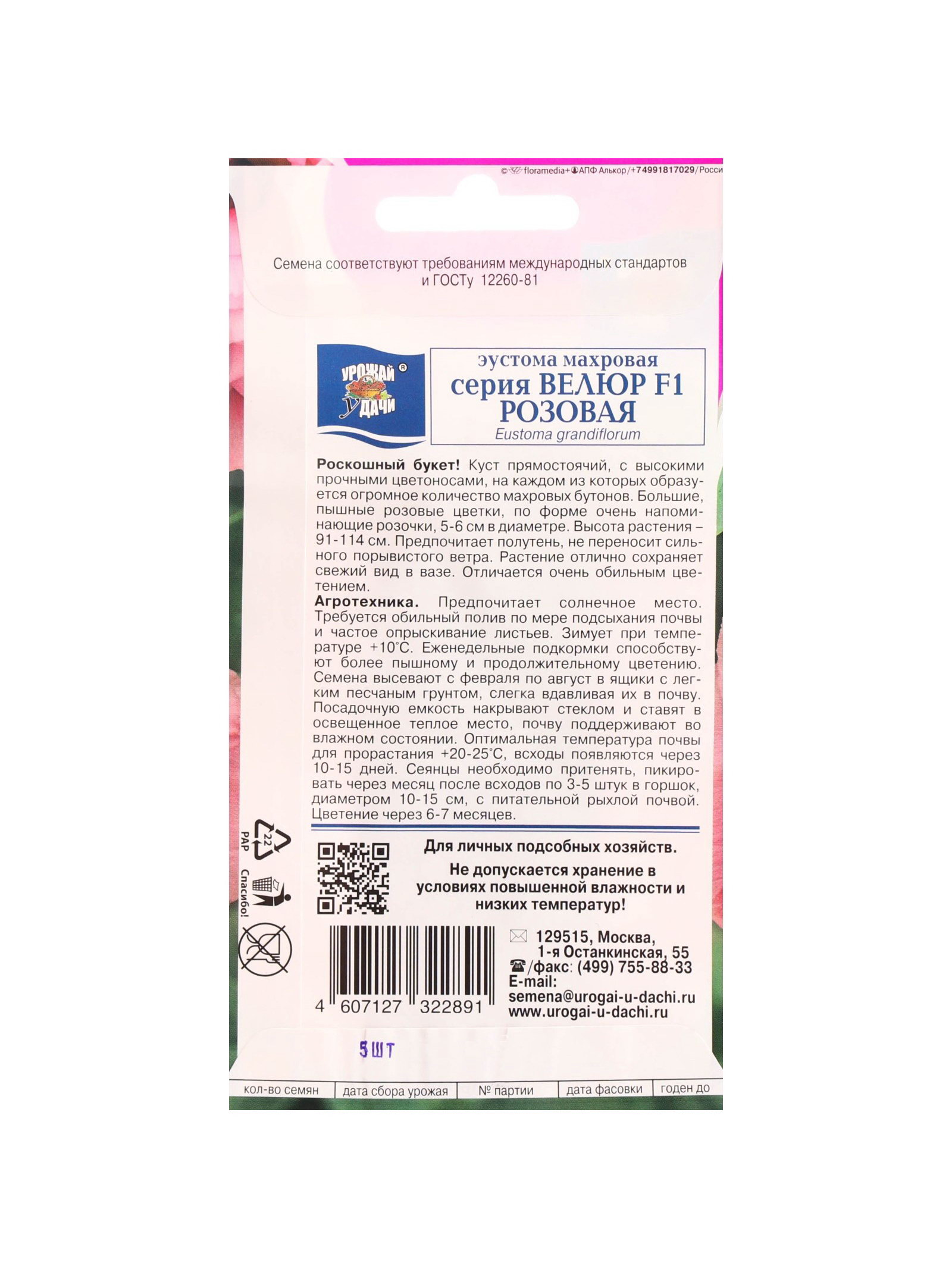 Набор семян Эустома махровая "Велюр", розовая, F1, в ампуле, 4 шт., 9x17x1 см., Мой выбор, Россия