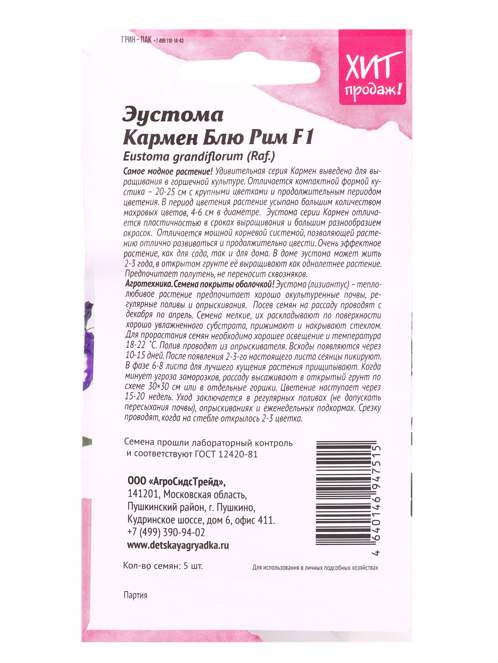 Семена цветов Эустома Кармен Блю Рим 5 шт, Агросидстрейд, Чили
