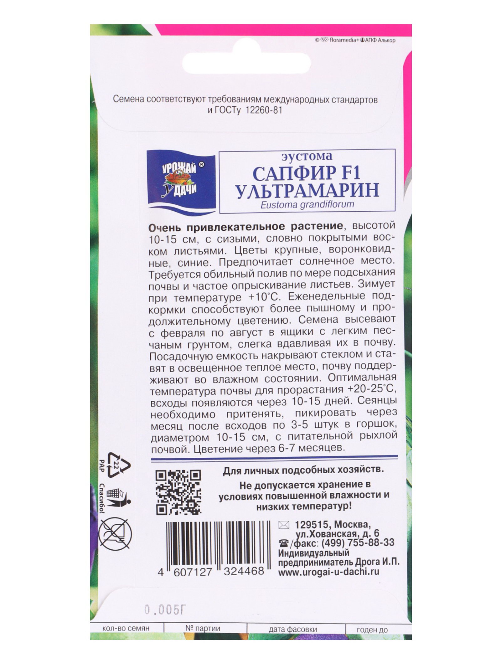 Семена цветов Эустома сапфир Ультрамарин 0.005 гр ампл., УРОЖАЙ УДАЧИ, Россия