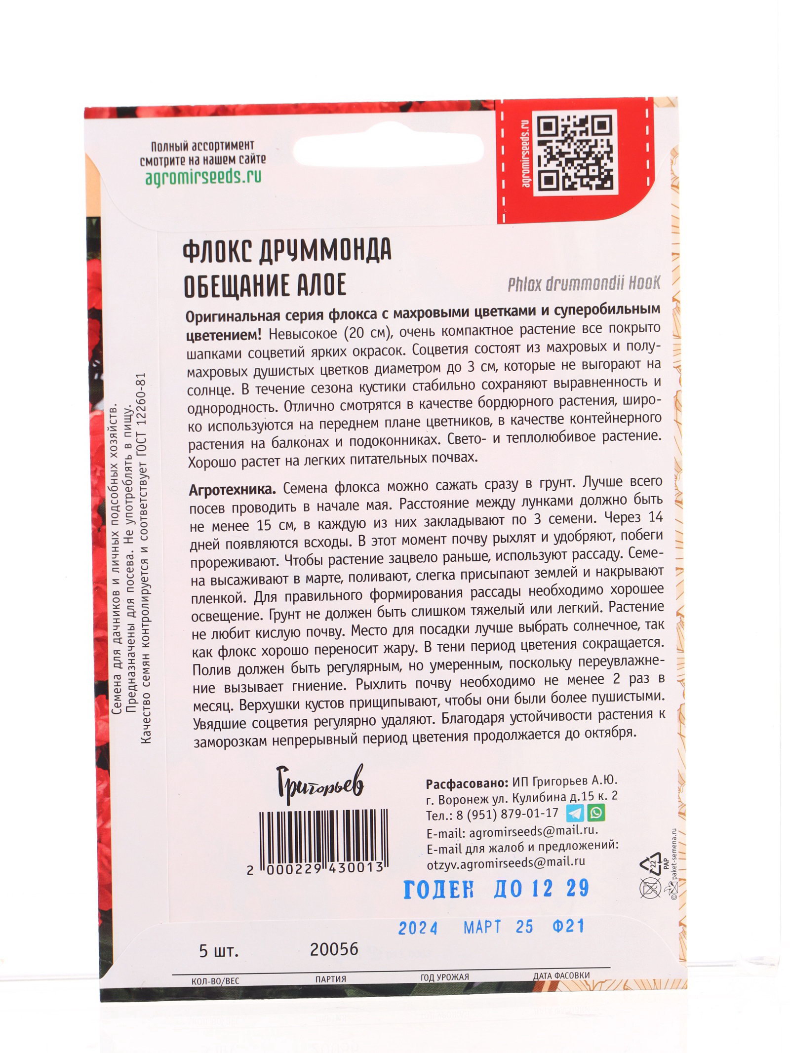 Семена цветов Флокс Обещание Алое махровый 5 шт. 12.29 гр, Григорьев, Россия