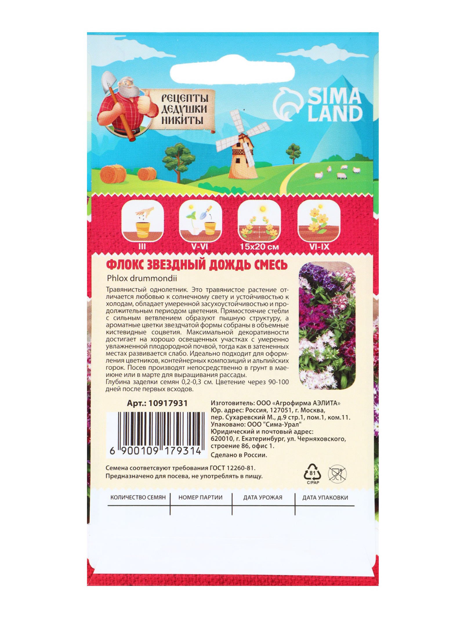 Семена цветов Флокс "Звездный дождь", смесь окрасок, 0.2 г, 7x15x1 см., Рецепты дедушки Никиты, Россия