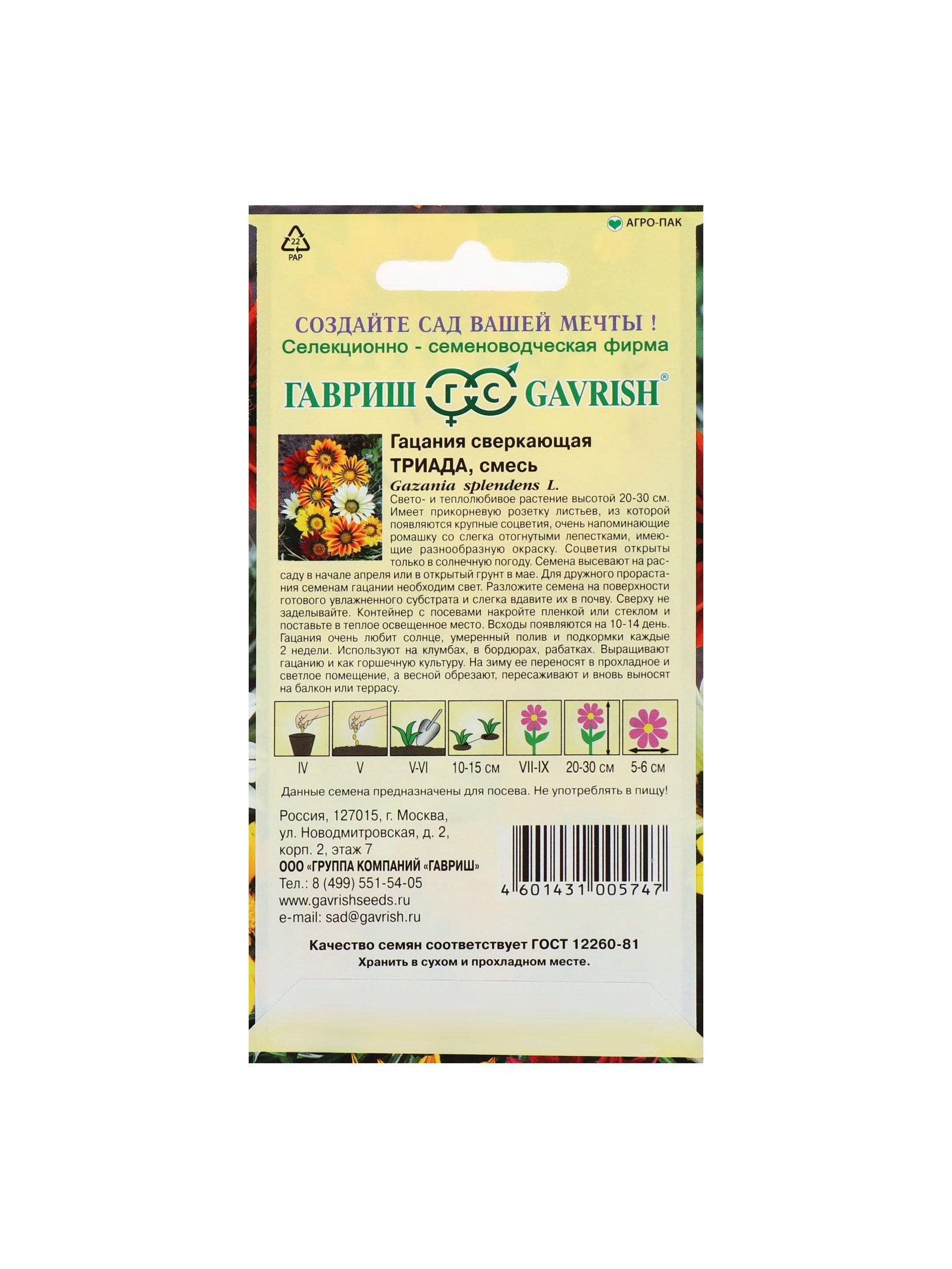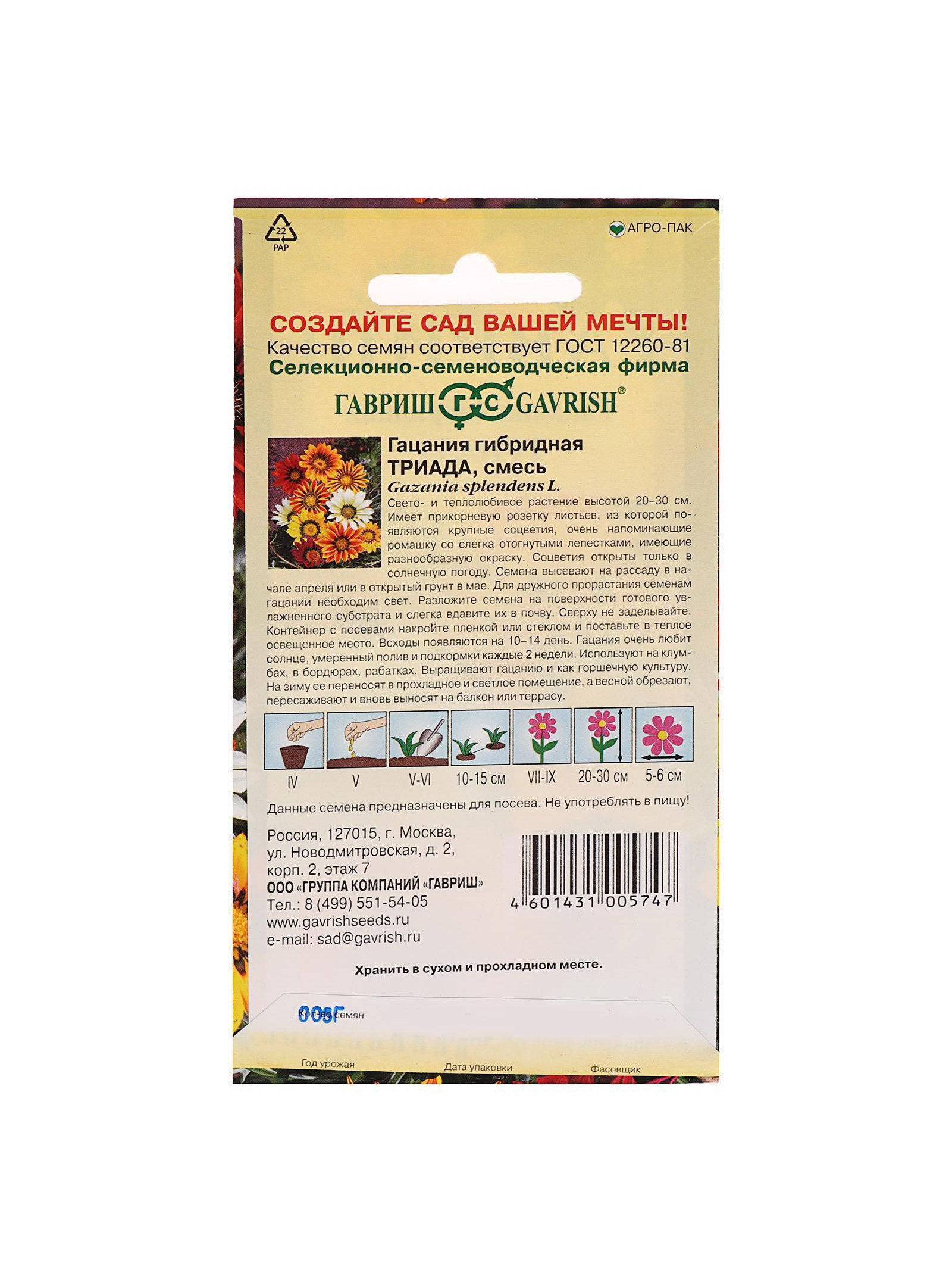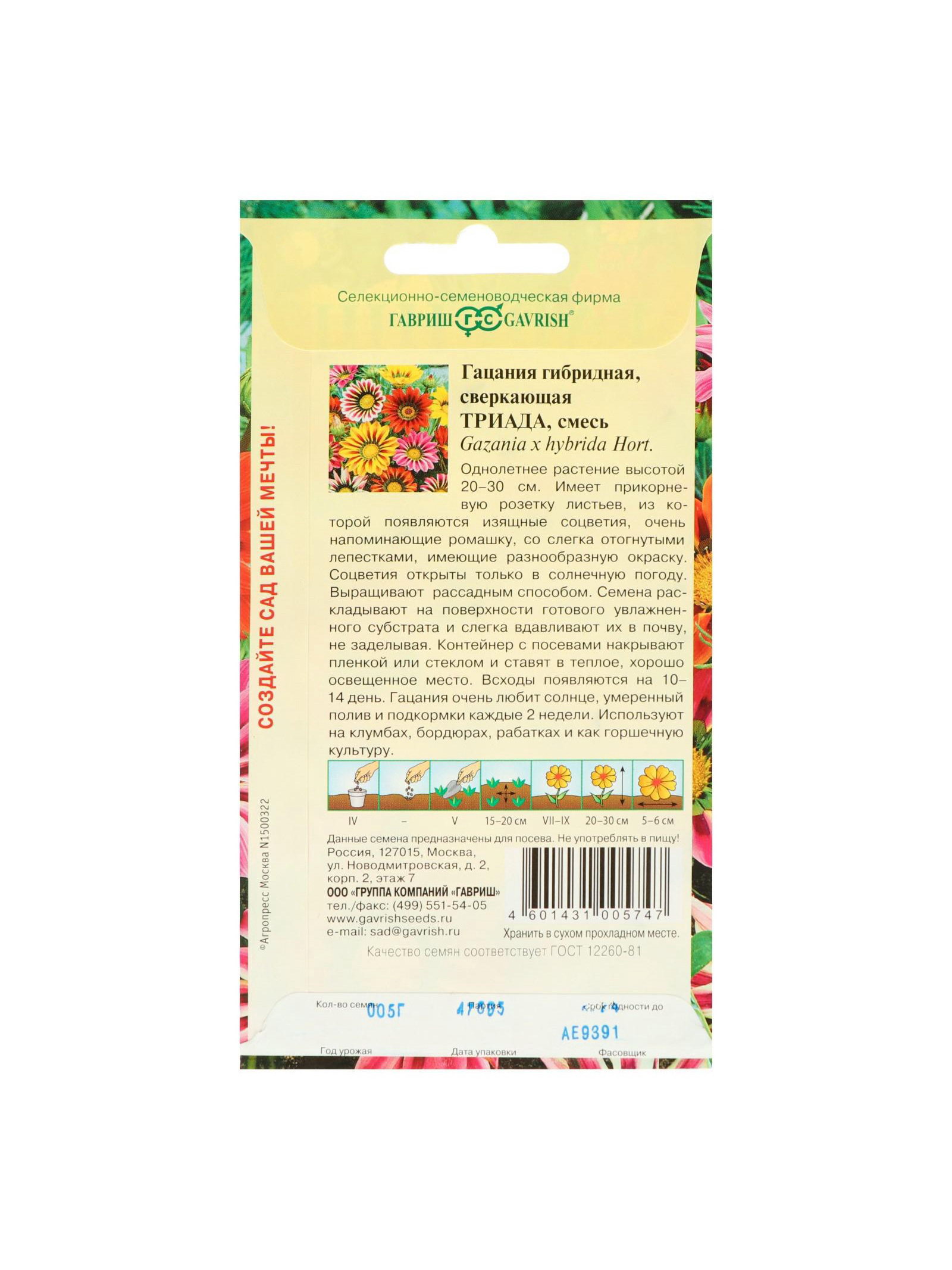 Набор семян Гацания крупноцветковая "Триада", смесь, О, 5 шт., 9x17x1 см., Мой выбор, Россия