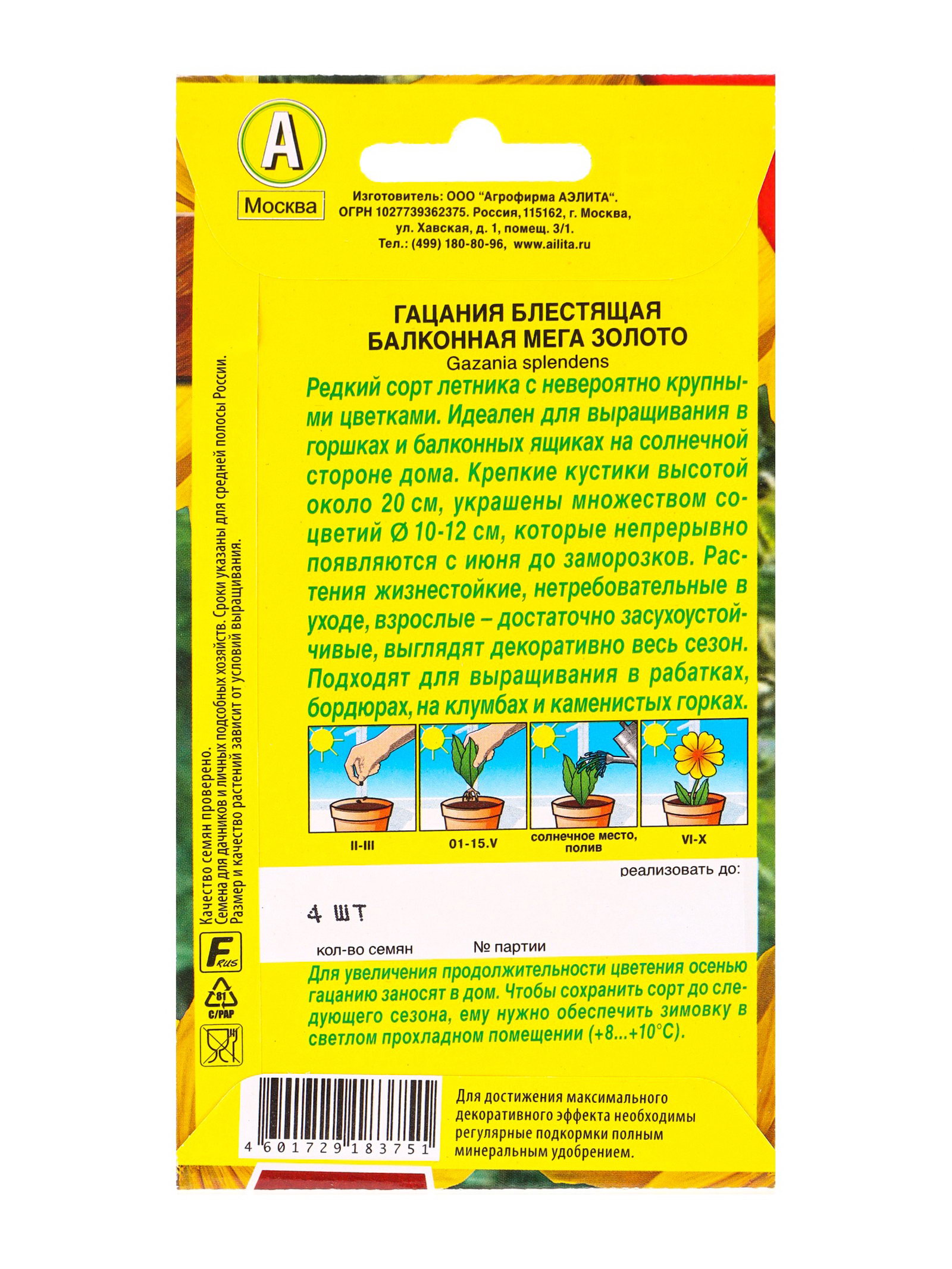 Семена цветов Гацания Балконная мега золото Цветущий балкон, Ц/П,4 шт., Агрофирма АЭЛИТА, Нидерланды