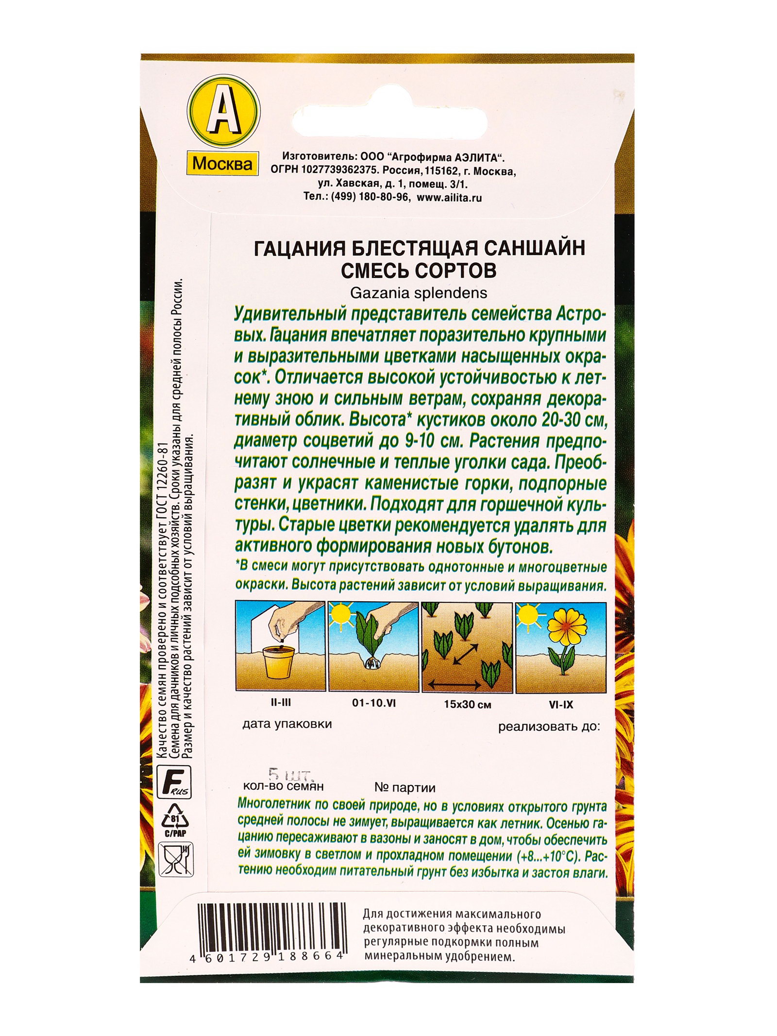 Семена цветов Гацания Саншайн, смесь сортов Золотая серия, Ц/П,5 шт., Агрофирма АЭЛИТА, Нидерланды
