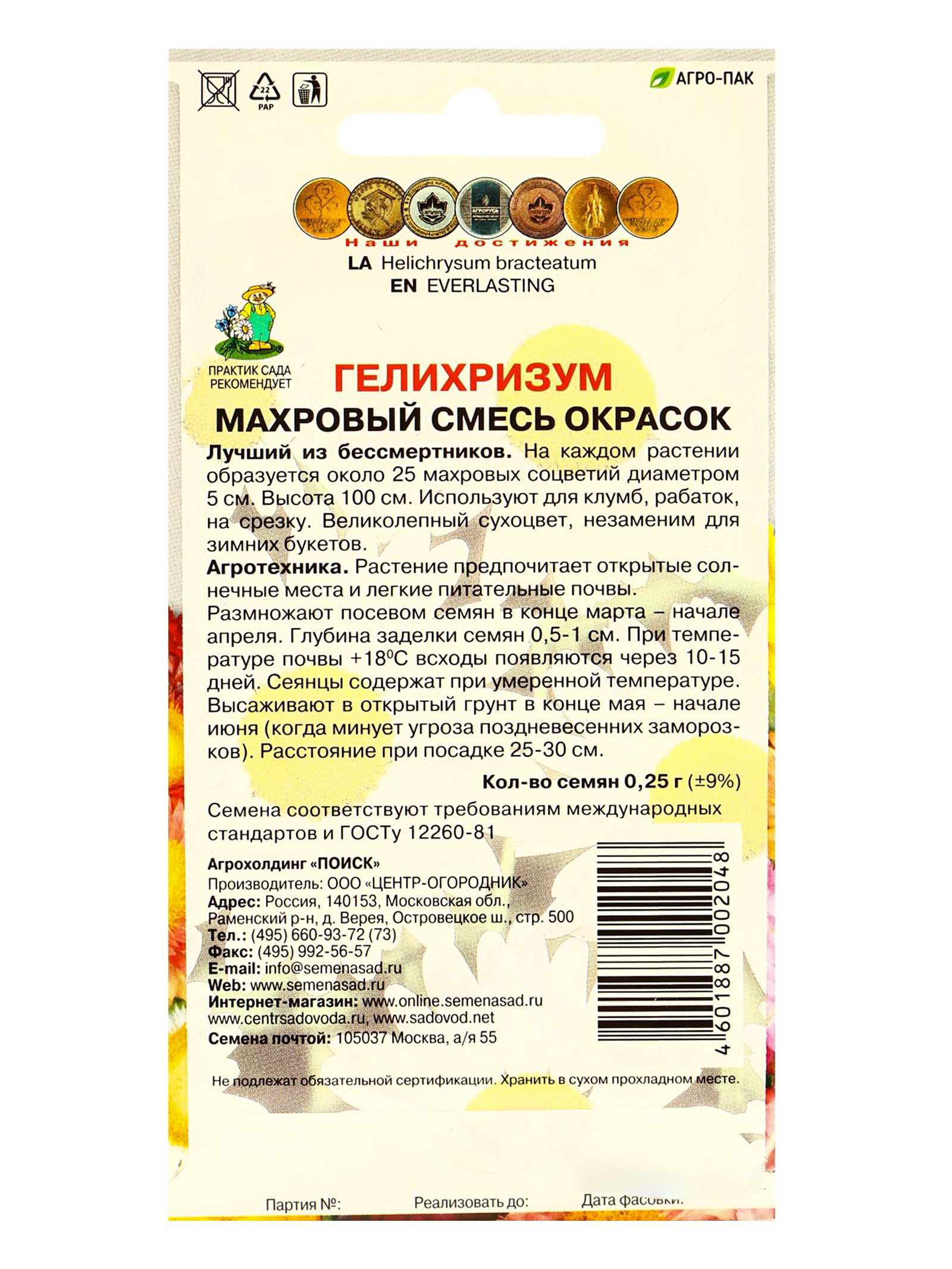 Цветение период: Август, Июль, Сентябрь Посев (посадка) в грунт: Июнь, Май Посев на рассаду: Апрель, Март Размер упаковки: 8 x 0.1 x 15 см. Сухоцвет: Нет Махровые: Нет Место выращивания: Открытый грунт Вегетация: Многолетники Назначение: Для создания цветников, клумбы По форме куста: Кустовая Разновидность: Цветущее Отношение к свету: Светолюбивые Нуждаются ли в стратификации: Нет tnved: 1209300000 tnved: 1209300000 Высота растений: 60-100 см Температурное ограничение: Нет Цвет: Разноцветный Вид: Гелихризум На каждом растении образуется около 25махровых соцветий диаметром 5 см Высота 100 см Используют для клумб, рабаток, на срезку. Великолепный сухоцвет, незаменим для зимних букетов. Агротехника: растение предпочитает открытые солнечные места и легкие питательные почвы. Размножают посевом семян в конце марта – начале апреля. Глубина заделки семян 0,5-1 см При температуре почвы +18 С всходы появляются через 10-15 дней. Сеянцы содержат при умеренной температуре. Высаживают в открытый грунт в конце мая – начале июня (когда минует угроза поздневесенних заморозков). Расстояние при посадке 25-30 см | ||