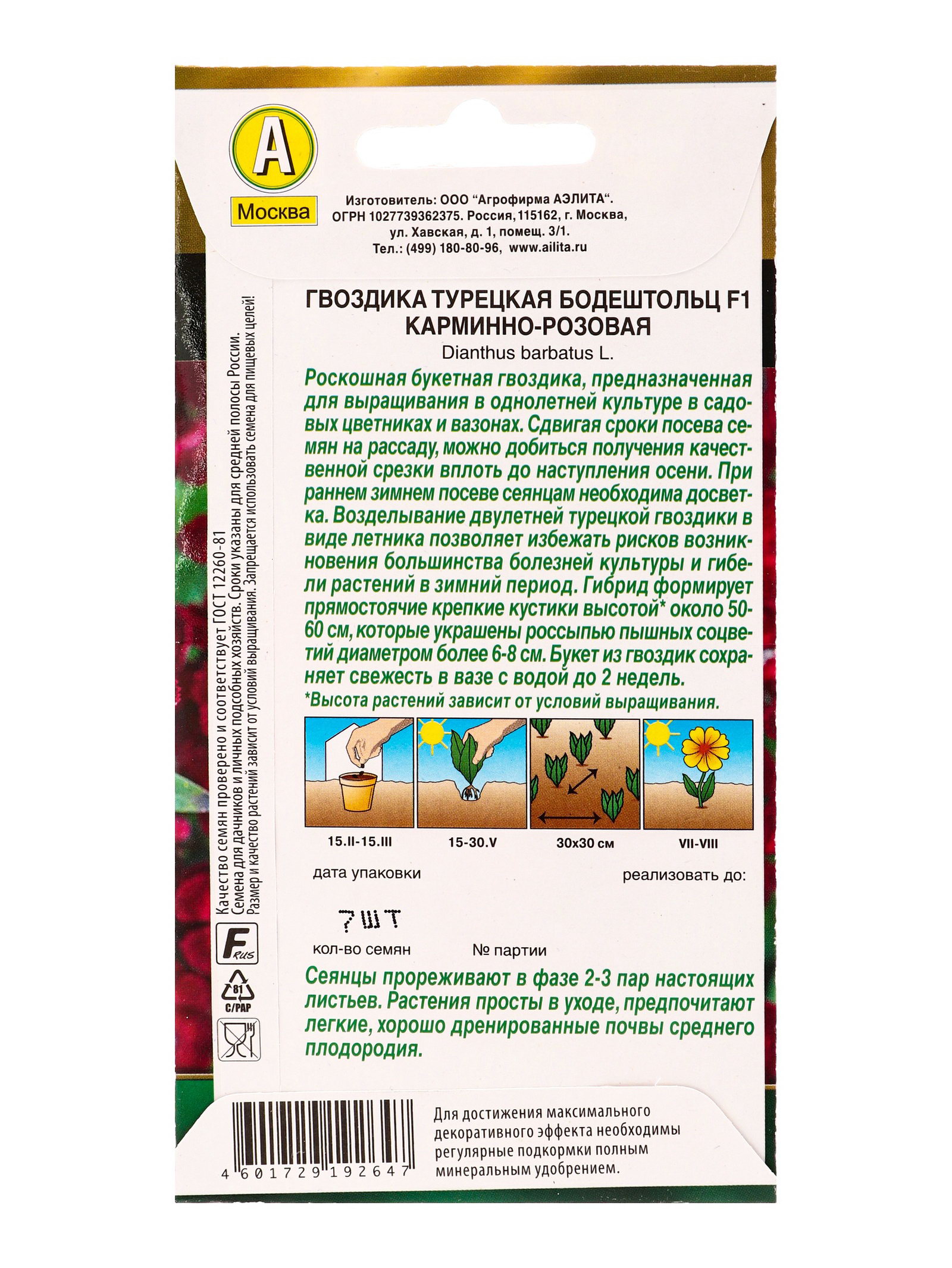 Семена цветов Гвоздика турецкая Бодештольц F1 карминно-розовая Золотая серия, Ц/П,7 шт., Агрофирма АЭЛИТА, Индонезия