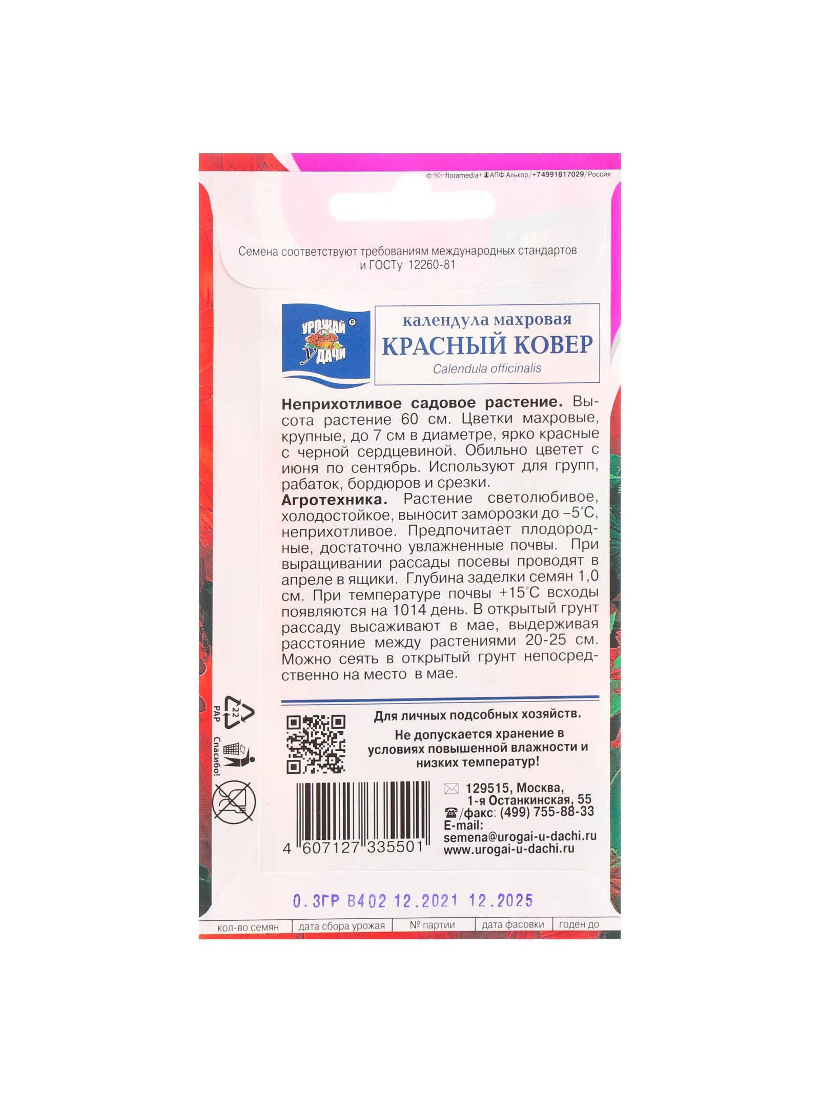 Набор семян Календула махровая "Красный ковёр", 5 шт., 9x17x1 см., Мой выбор, Россия