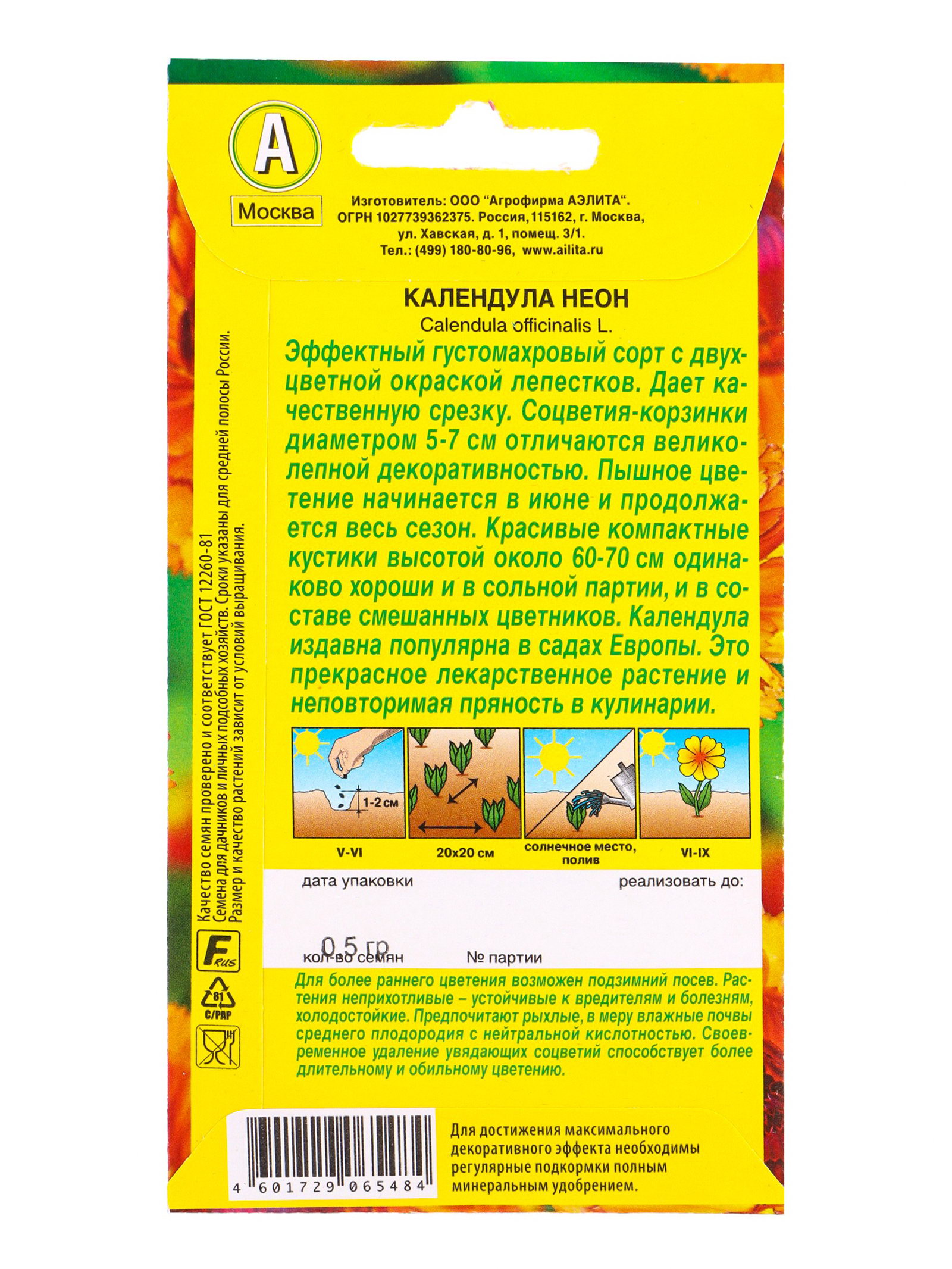Семена цветов Календула Неон, Ц/П,0.5 г, Агрофирма АЭЛИТА, Германия
