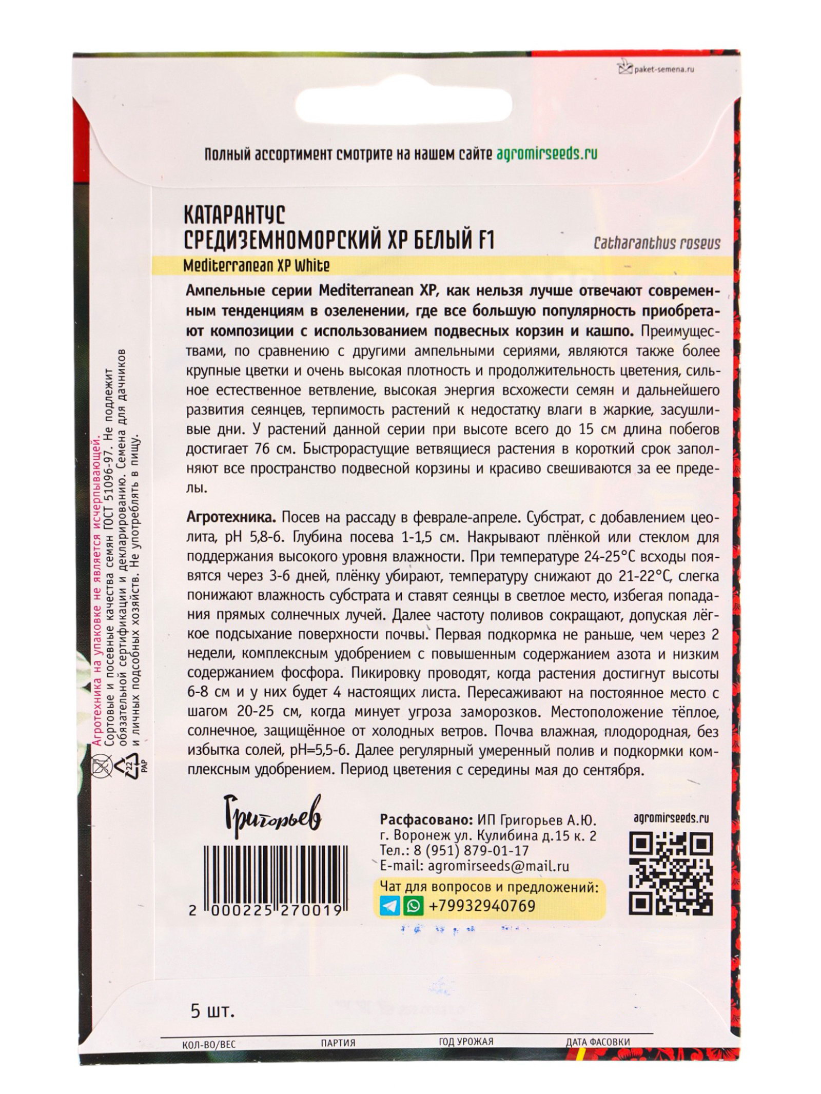 Семена цветов Катарантус Средиземноморский XP Белый F1, Григорьев, Россия
