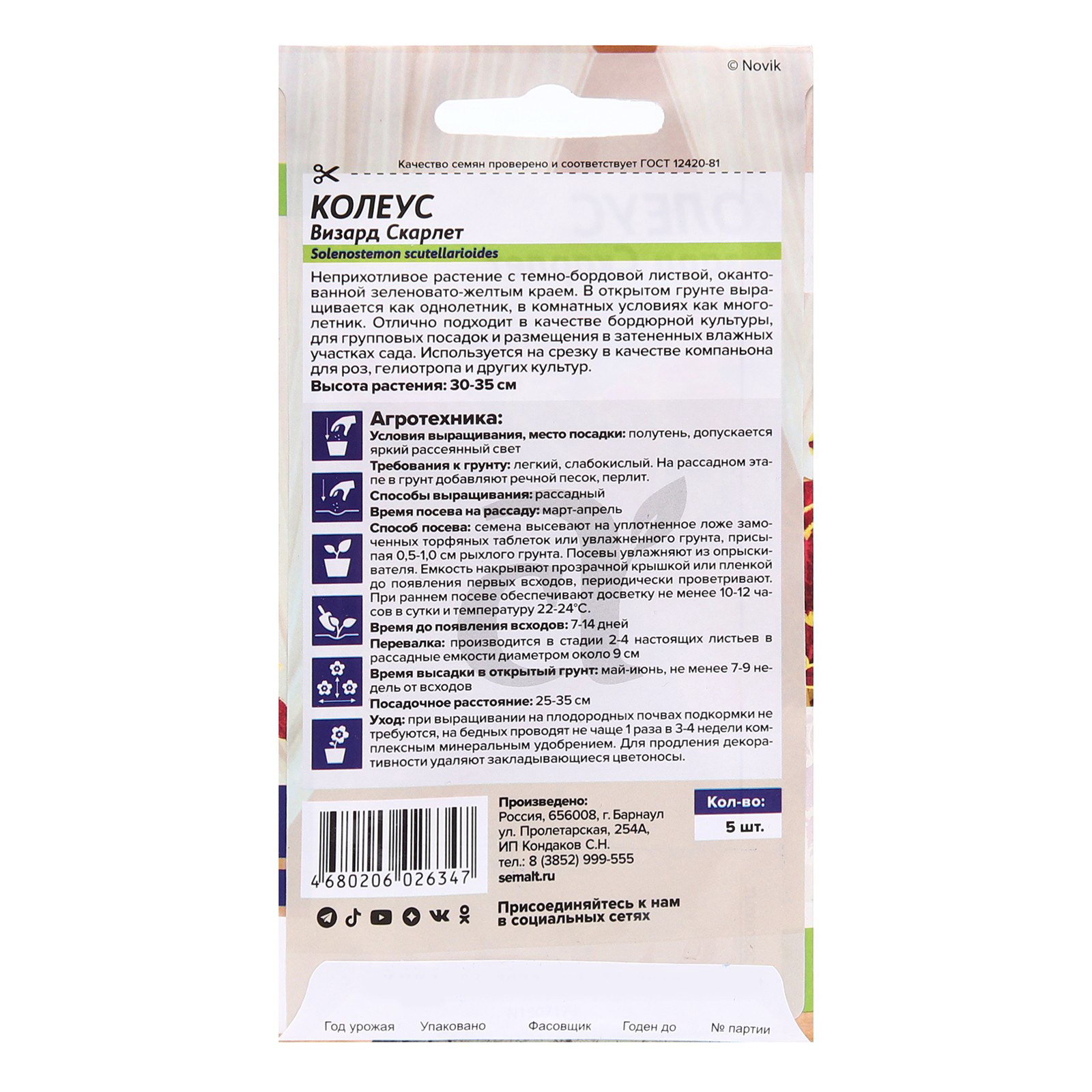 Семена комнатных цветов Колеус "Скарлет", ц/п, 5 шт., Семена Алтая, Россия