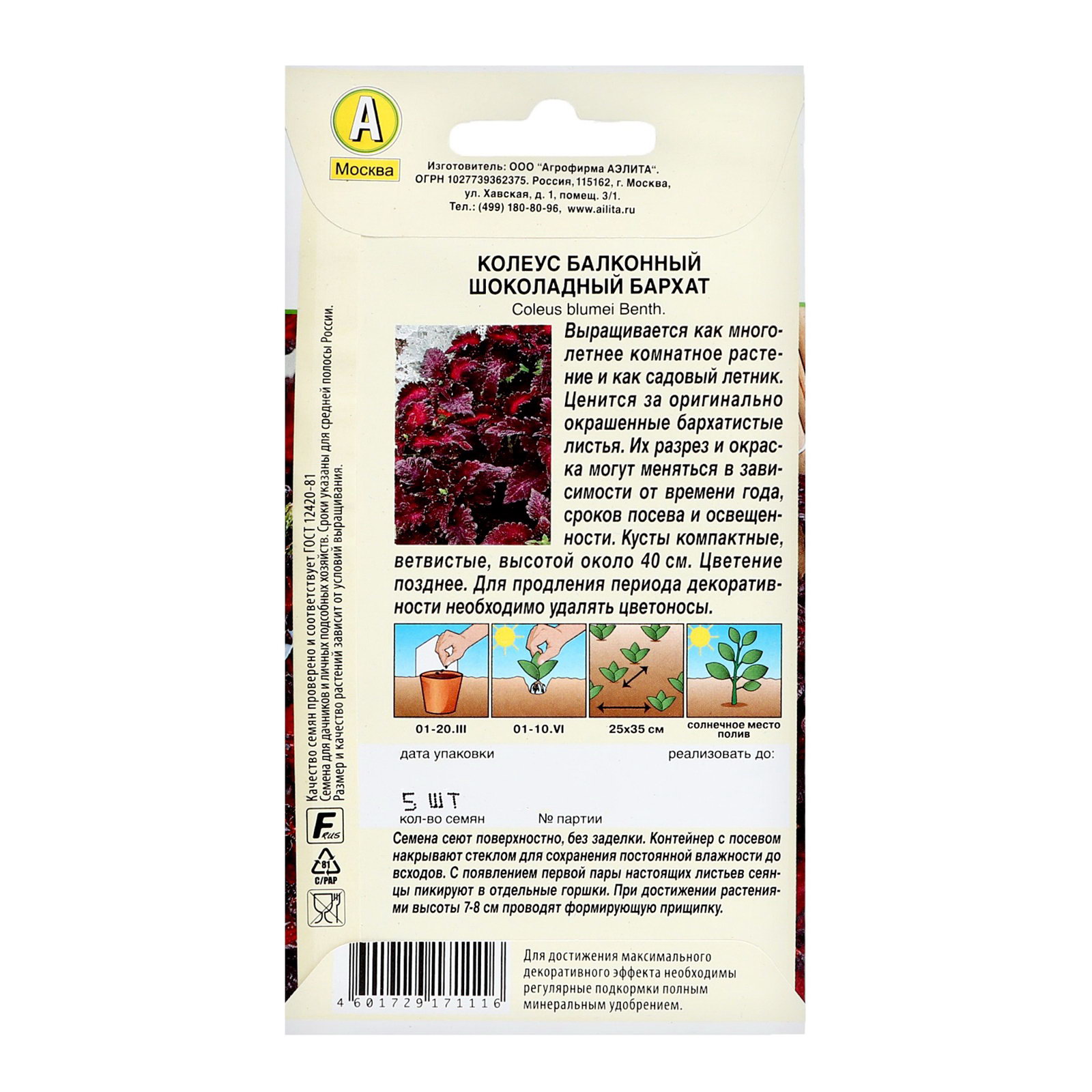 Семена цветов Колеус балконный "Шоколадный бархат", ц/п, 5 шт, Аэлита Агро, Коста-Рика