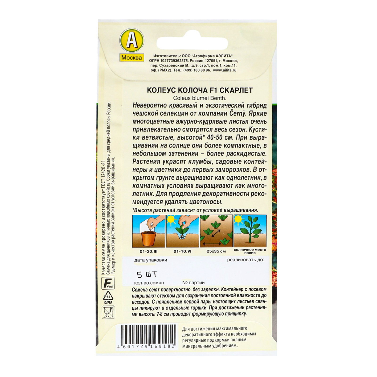 Семена цветов Колеус "Колоча" F1 скарлет, ц/п, 5 шт, Аэлита Агро, Чехия
