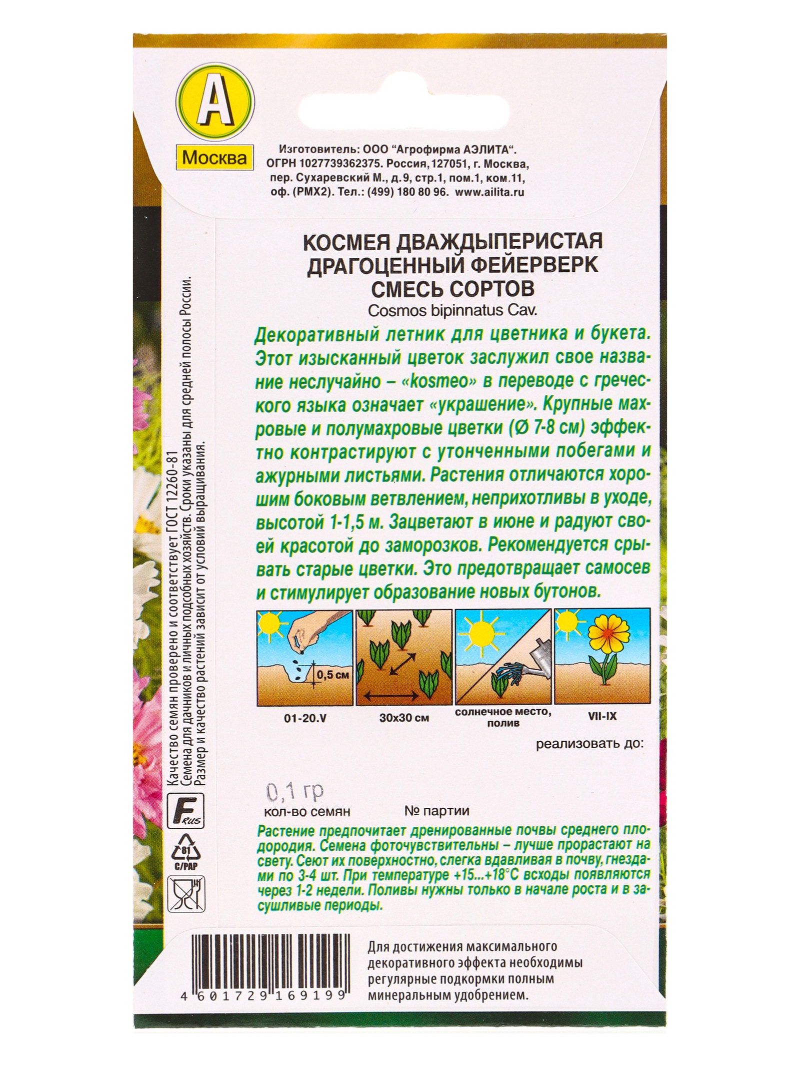 Семена цветов Космея Драгоценный фейерверк, смесь сортов Золотая серия, Ц/П,0.1 г, Агрофирма АЭЛИТА, Нидерланды
