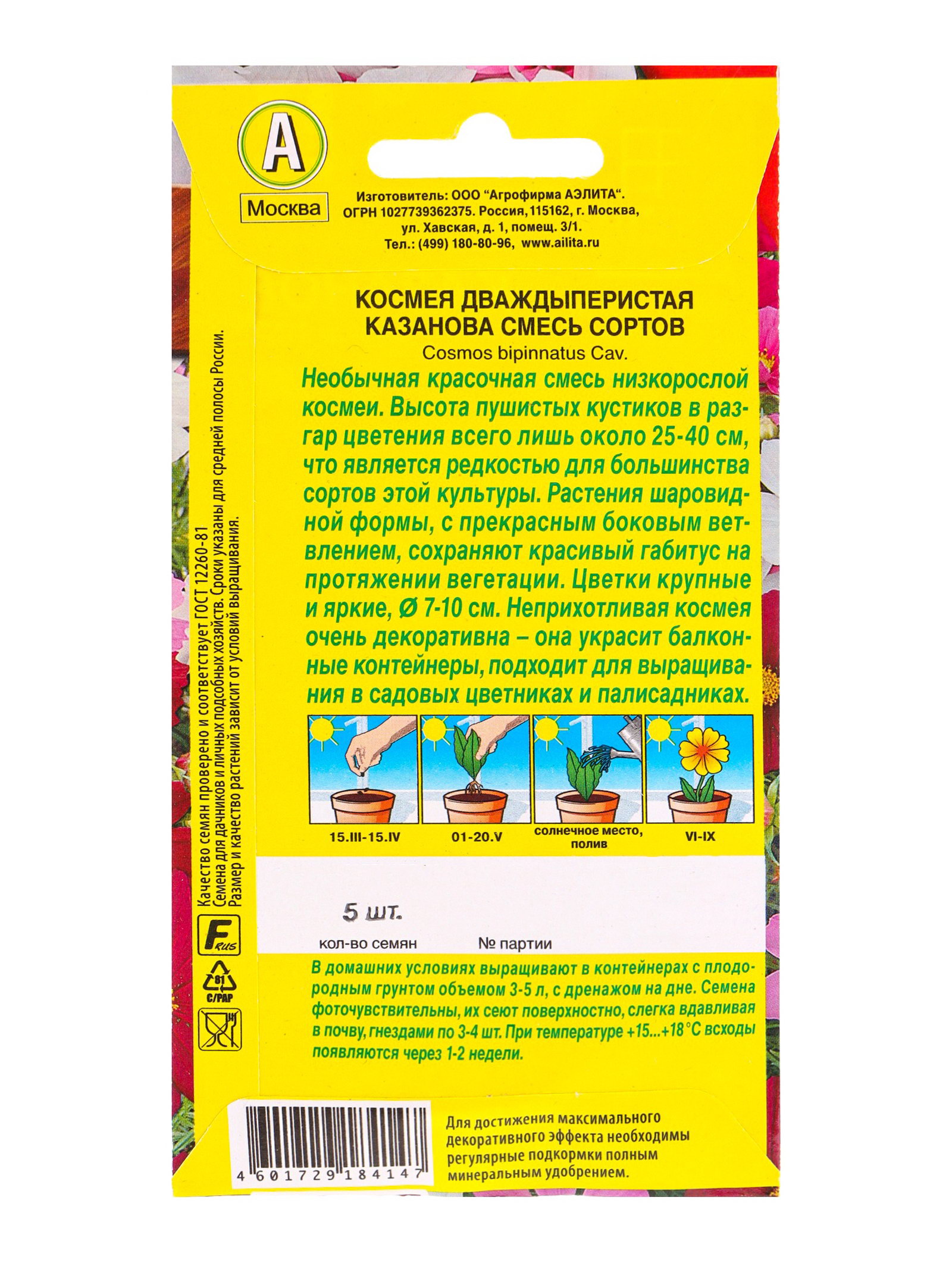 Семена цветов Космея Казанова, смесь сортов Цветущий балкон, Ц/П,5 шт., Агрофирма АЭЛИТА, Нидерланды
