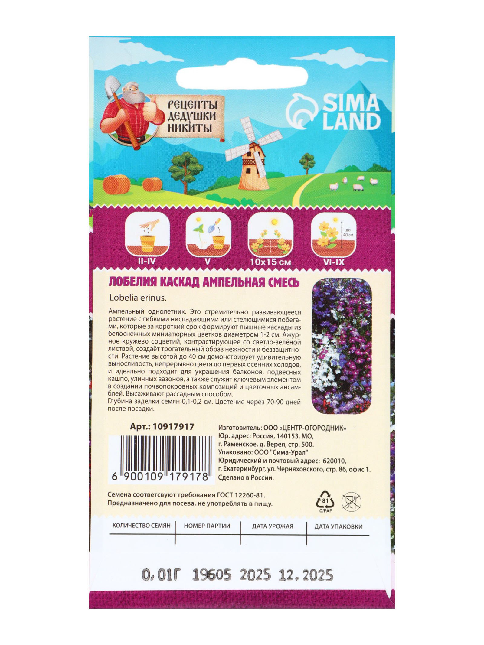 Семена цветов Лобелия "Каскад", ампельная, смесь 0.01 г, 7x15x1 см., Рецепты дедушки Никиты, Россия