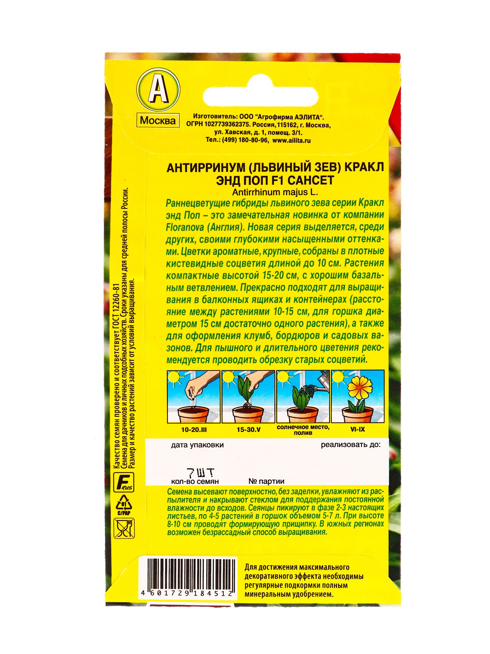 Семена цветов Львиный зев Кракл энд поп F1 сансет С. Floranova Цветущий балкон, Ц/П,7 шт., Агрофирма АЭЛИТА, Индонезия