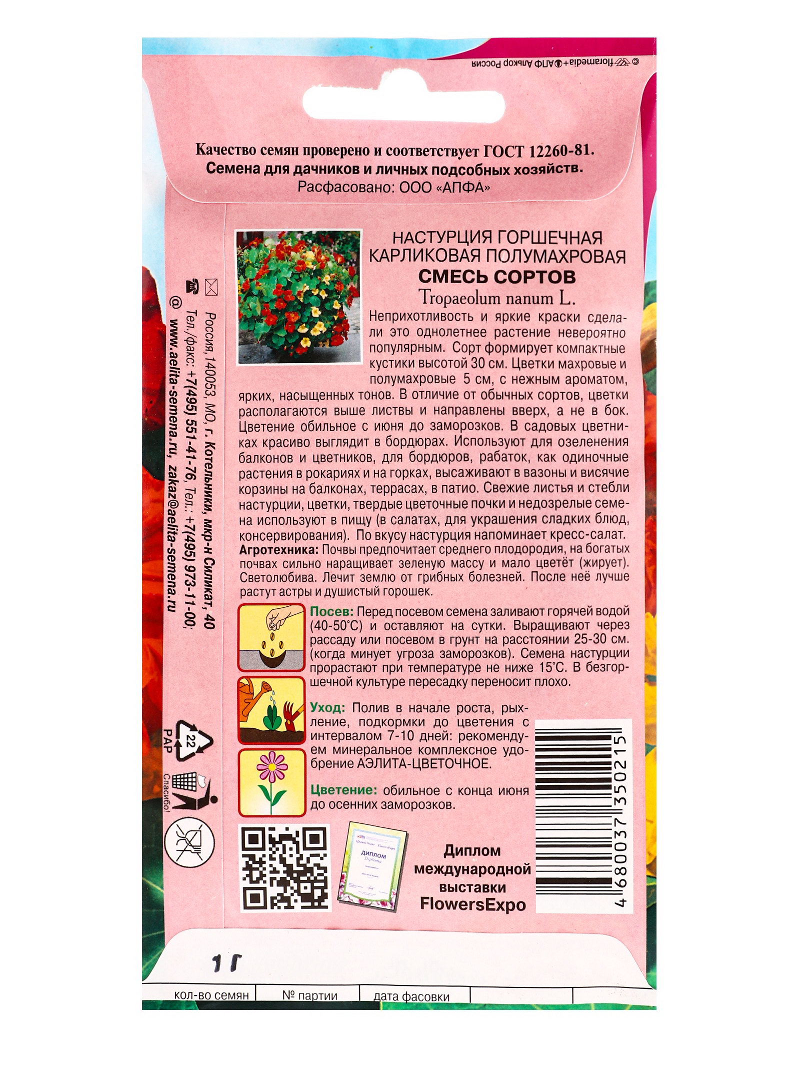 Семена цветов Настурция Горшечная карликовая полумахровая, смесь А/З, Ц/П,1 г, Агрофирма АЭЛИТА, Россия
