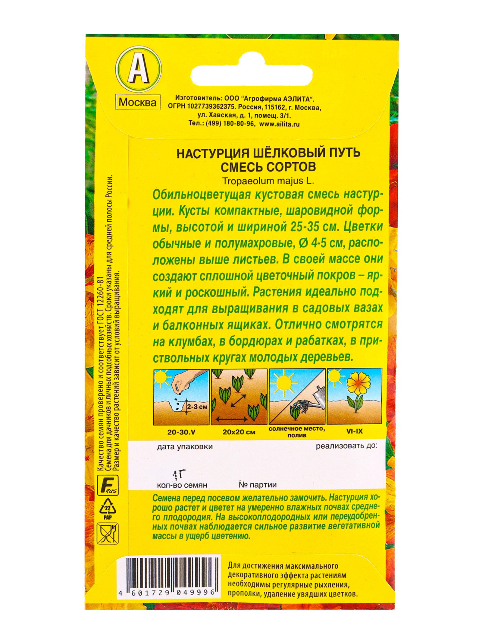 Семена цветов Настурция махровая Шелковый путь, смесь сортов, Ц/П,1 г, Агрофирма АЭЛИТА, Нидерланды