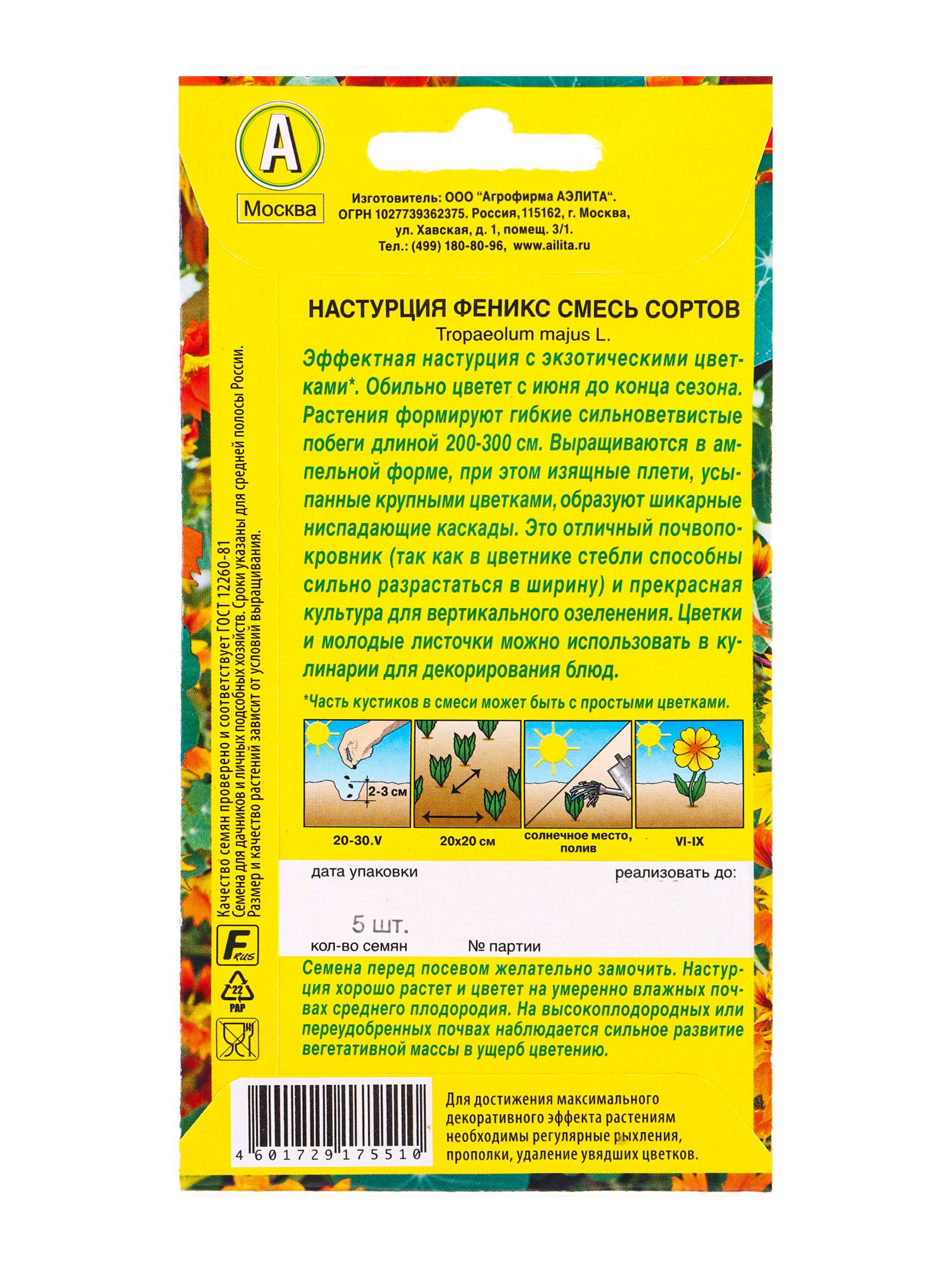 Семена цветов Настурция Феникс, смесь сортов, Ц/П,5 шт., Агрофирма АЭЛИТА, Индия