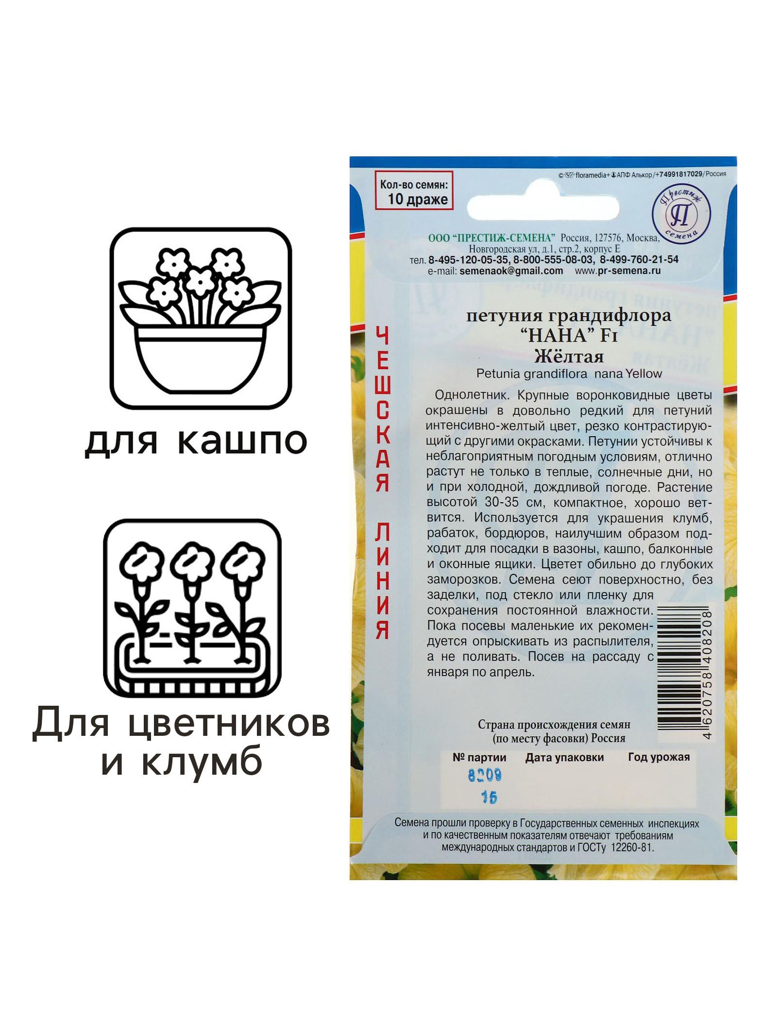 Цветение период: Август, Июль, Июнь, Сентябрь Размер упаковки: 8 x 0.2 x 15 см. Сорт: F1 Сухоцвет: Да Махровые: Нет По форме куста: Кустовая Назначение: Для создания цветников, клумбы Отношение к свету: Светолюбивые Разновидность: Цветущее Нуждаются ли в стратификации: Нет Нуждаются ли в стратификации: Нет tnved: 1209300000 Цвет: Жёлтый Высота, см: [40,45] Упаковка: Цветная Особенности выращивания: Открытый грунт Вид: Петуния Вегетация: Однолетники Агрономический срок годности, лет: 3 Однолетник. Крупные воронковидные цветы окрашены в довольно редкий для петуний интенсивно-желтый цвет, резко контрастирующий с другими окрасками. Петунии устойчивы к неблагоприятным погодным условиям, отлично растут не только в теплые, солнечные дни, но и при холодной, дождливой погоде. Растение высотой 30-35 см, компактное, хорошо ветвится. Используется для украшения клумб, рабаток, бордюров, наилучшим образом подходит для посадки в вазоны, кашпо, балконные и оконные ящики. Цветет обильно до глубоких заморозков. Семена сеют поверхностно, без заделки, под стекло или пленку для сохранения постоянной влажности. Пока посевы маленькие их рекомендуется опрыскивать из распылителя, а не поливать. Посев на рассаду с января по апрель. | ||