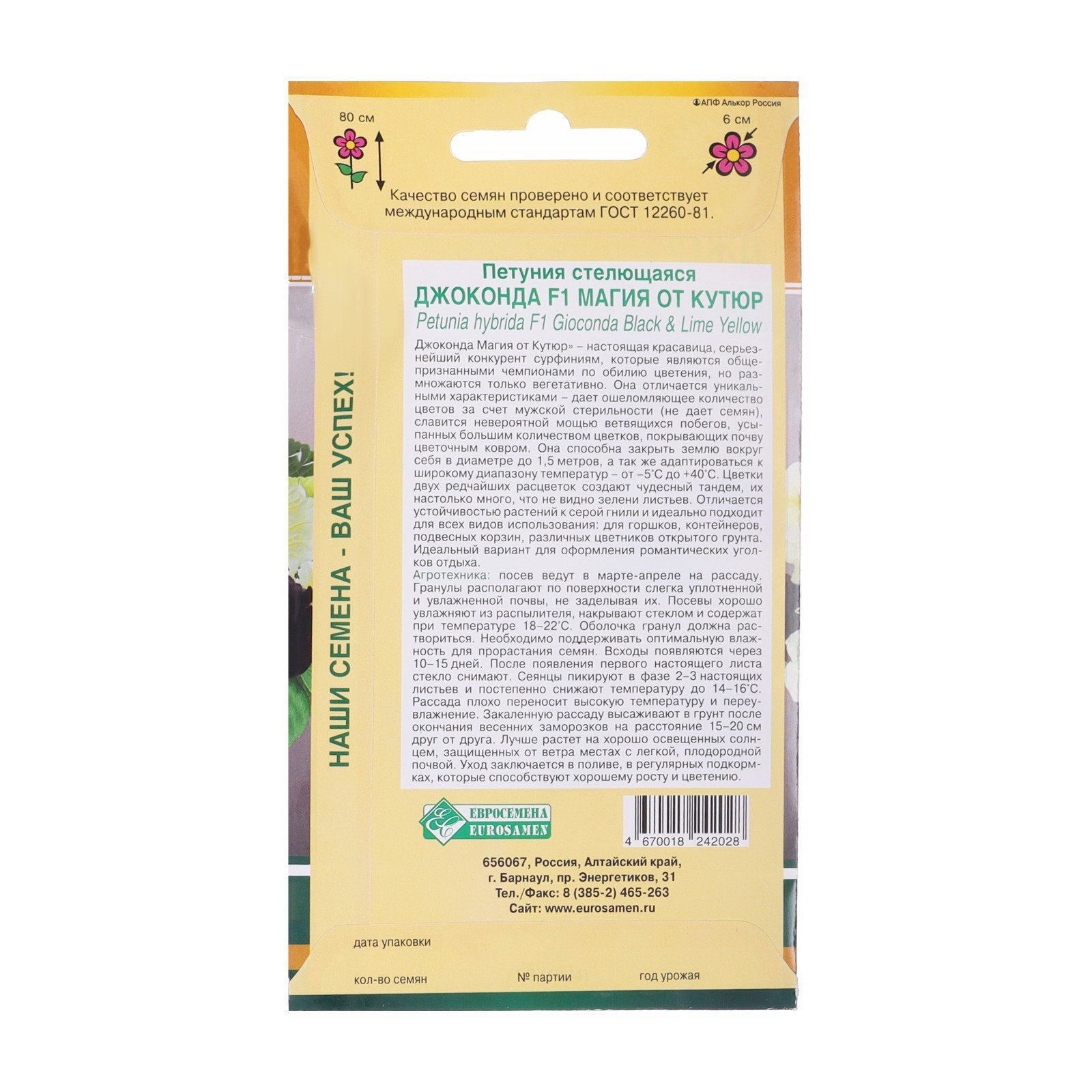 Посев на рассаду: Апрель, Март Цветение период: Август, Июль, Июнь, Сентябрь Размер упаковки: 8 x 0.4 x 15 см. Температурное ограничение: Нет Цвет: МИКС Вид: Петуния Место выращивания: Открытый грунт Махровые: Нет Сухоцвет: Нет tnved: 1209300000 По форме куста: Кустовая Назначение: Для балкона, веранды Отношение к свету: Светолюбивые Нуждаются ли в стратификации: Нет Вегетация: Однолетники Посев (посадка) в грунт: Май Высота растений: До 30 см Наша коллекция семян включает как популярные овощи, так и яркие цветы, идеально подходящие для вашего сада. С нами вы сможете наслаждаться богатым урожаем и великолепием цветения в любое время года. Данные семена идеально подойдут для выращивания в вашем саду. | ||