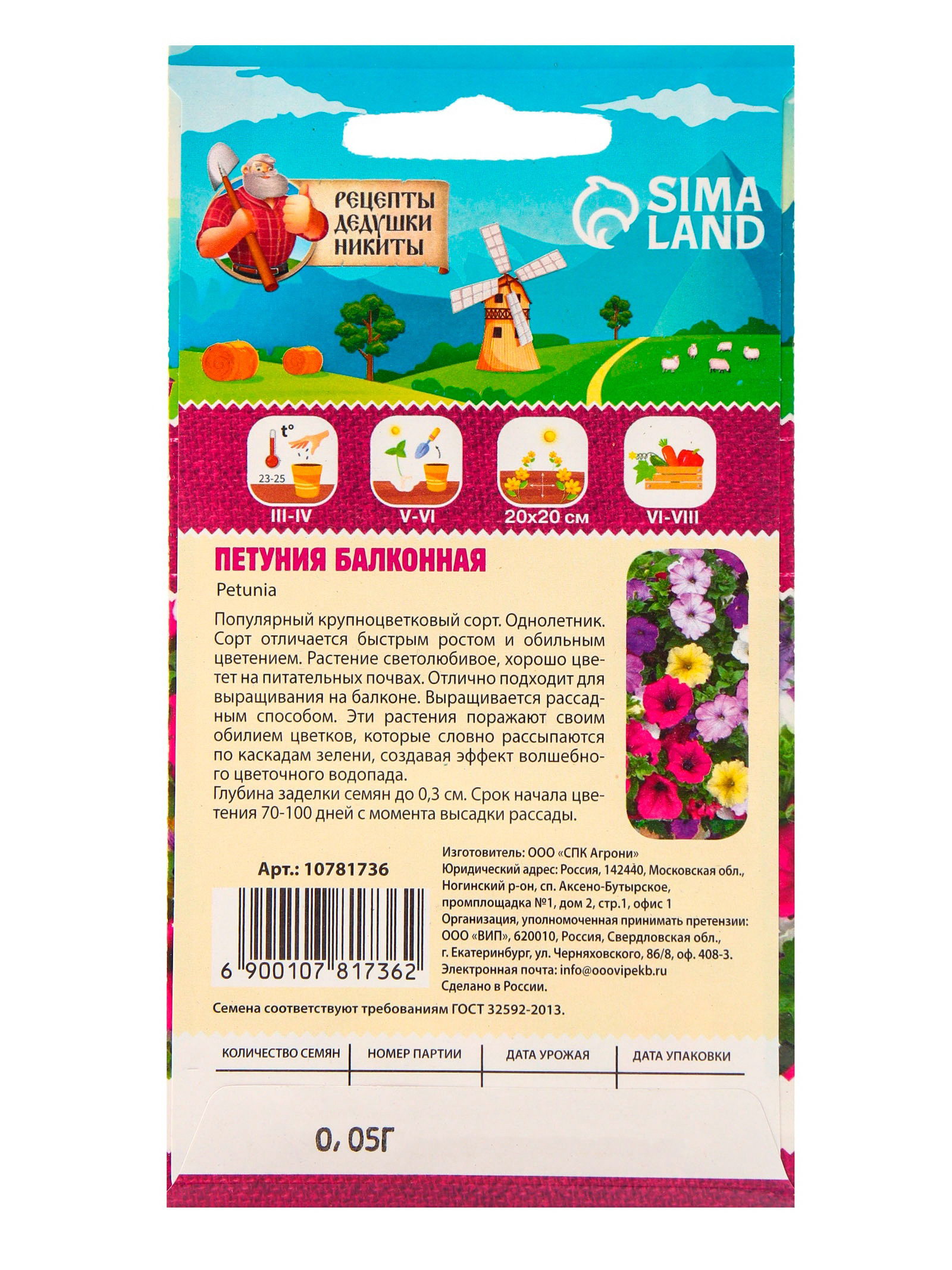 Семена цветов Петуния "Балконная", 0.05 г, 7x15x1 см., Рецепты дедушки Никиты, Россия