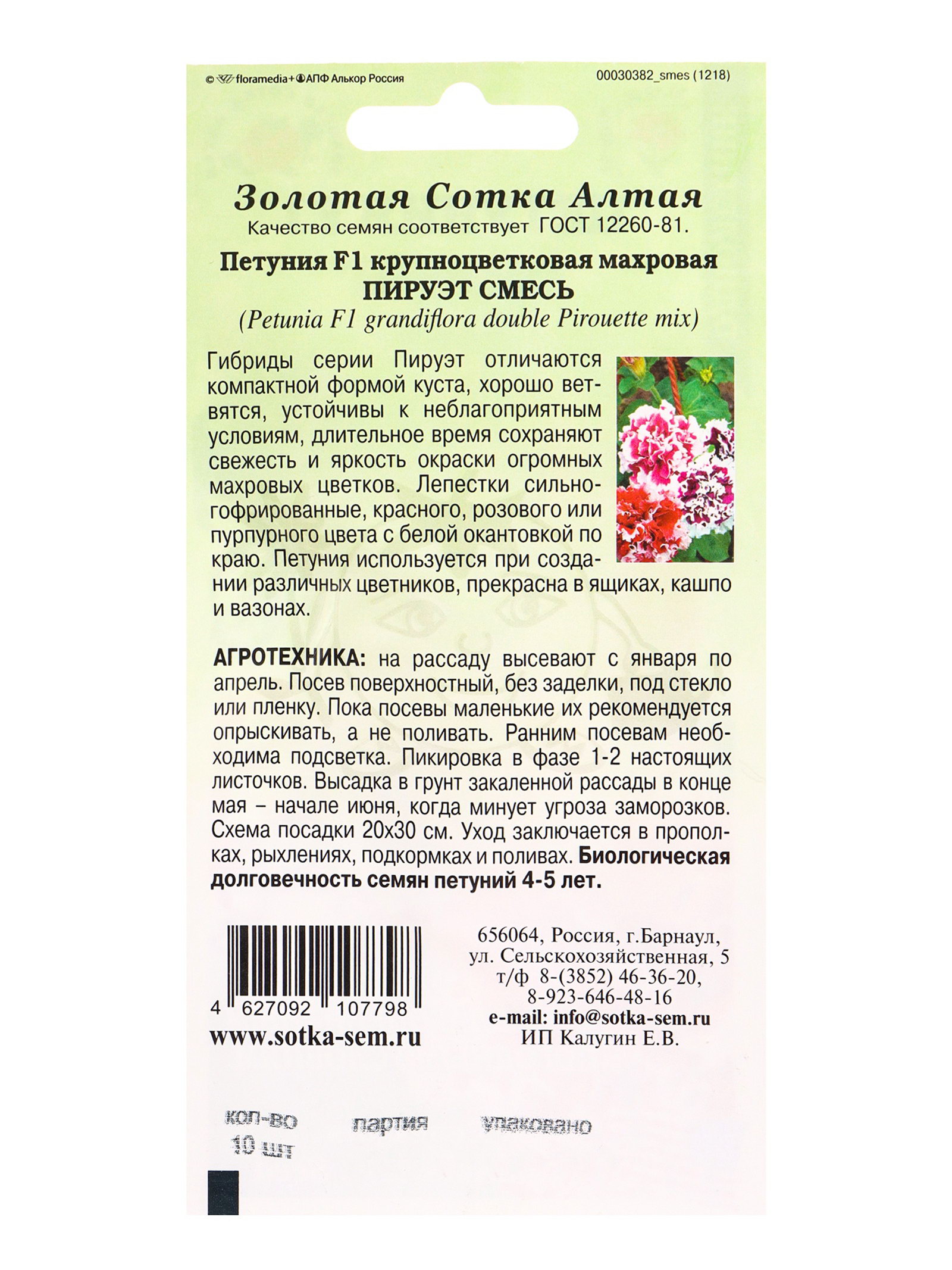 Семена Петуния "Пируэт", F1, 10 шт., смесь, Золотая Сотка Алтая, Россия