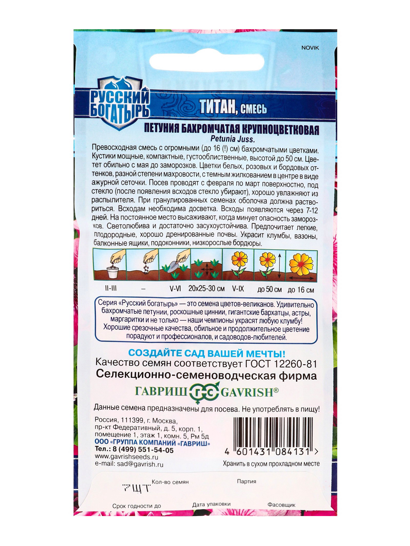 Набор семян Петуния "Титан", бахромчатая, смесь, серия Русский богатырь, 5 шт., 9x17x1 см., Мой выбор, Россия