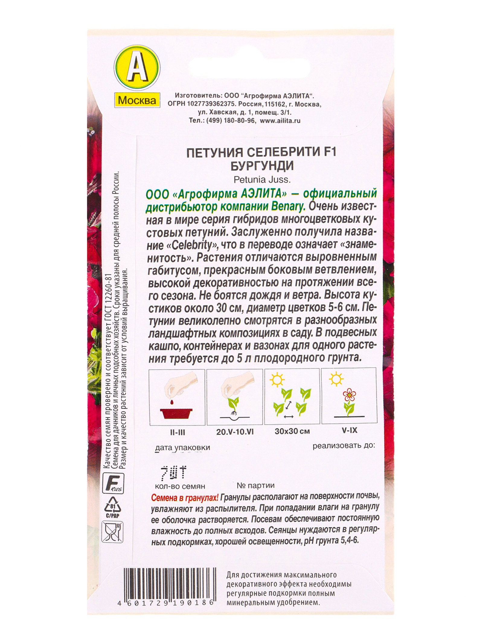 Семена цветов Петуния "Селебрити", F1, бургунди, многоцветковая, драже, Benary, 7 шт., Агрофирма АЭЛИТА, Германия