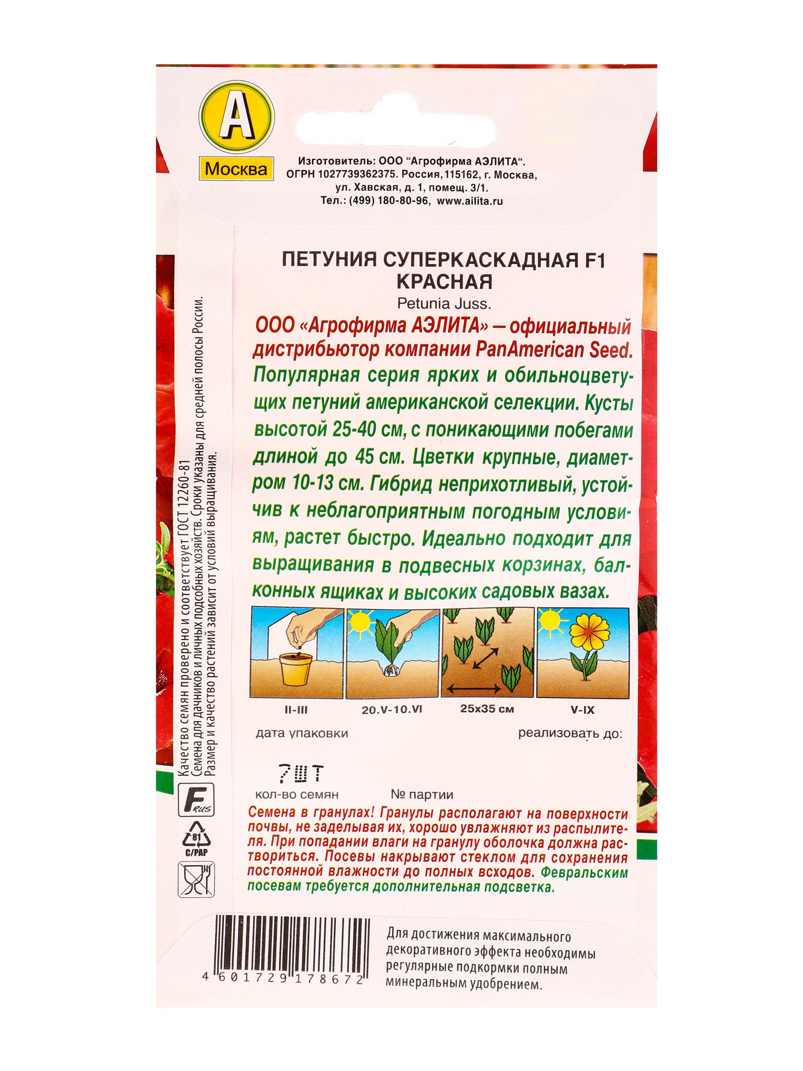 Семена цветов Петуния суперкаскадная F1 красная, Агрофирма АЭЛИТА, Россия