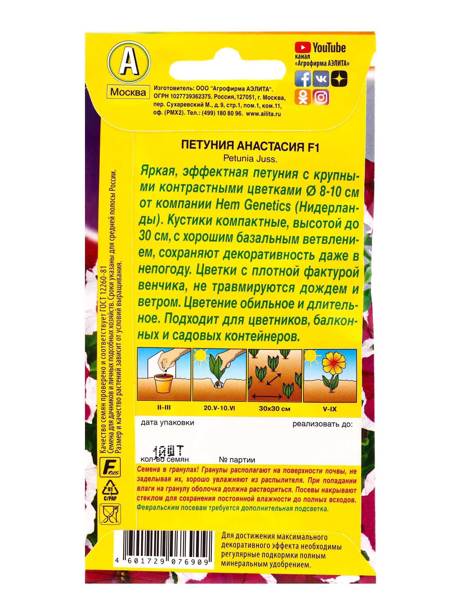 Семена цветов Петуния "Анастасия", F1, крупноцветковая, драже в пробирке, 10 шт., Агрофирма АЭЛИТА, Италия