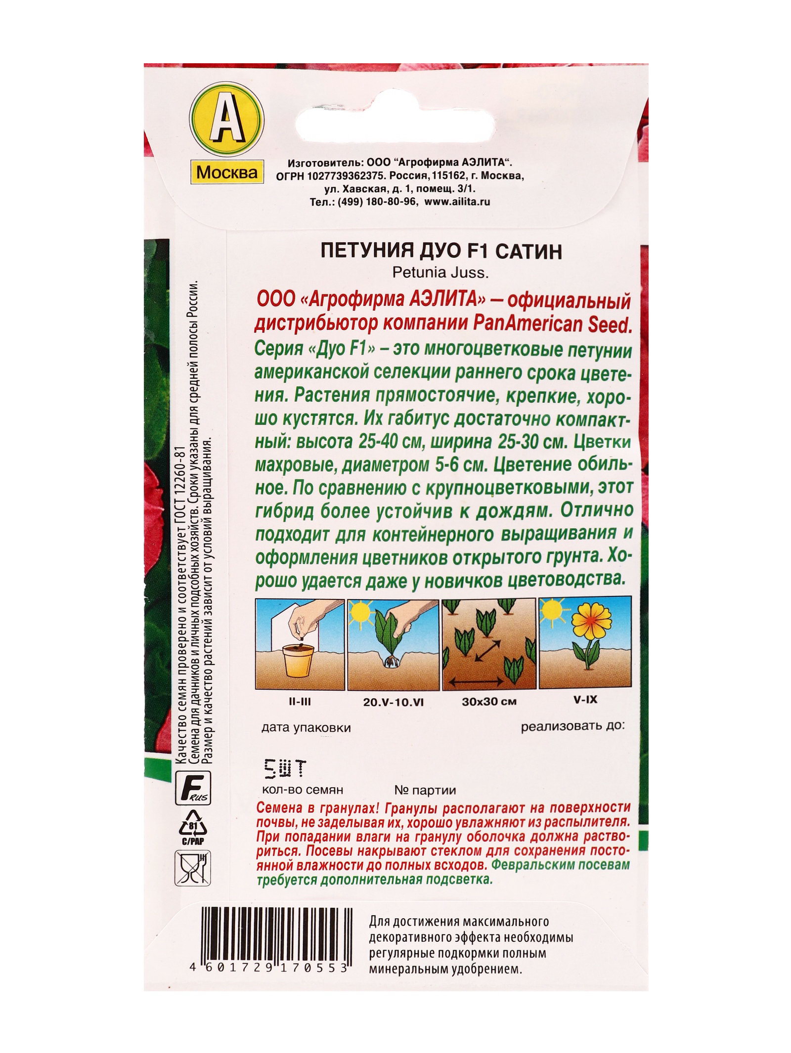 Семена цветов Петуния "Дуо", F1, сатин, драже в пробирке, PanAmerican, 5 шт., Агрофирма АЭЛИТА, Коста-Рика