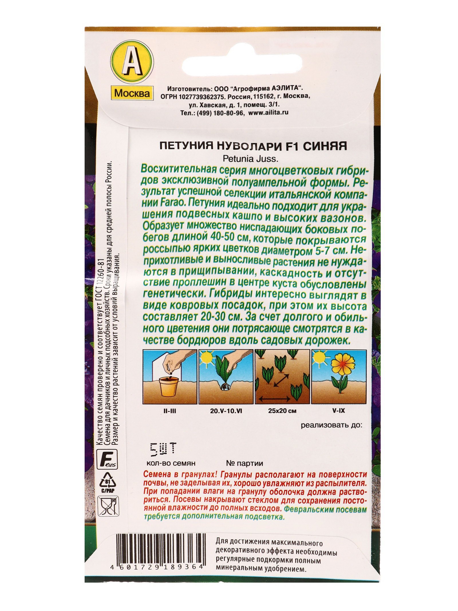 Назначение: Для балкона, веранды, Для создания цветников, клумбы Посев (посадка) в грунт: Июнь, Май Цветение период: Август, Июль, Июнь, Май, Сентябрь Посев на рассаду: Март, Февраль Размер упаковки: 8 x 0.2 x 15 см. tnved: 1209918000 Температурное ограничение: Нет Цвет: Синий Высота растений: До 30 см Махровые: Нет Отношение к свету: Светолюбивые Сухоцвет: Нет По форме куста: Кустовая Нуждаются ли в стратификации: Нет Вид: Петуния Вегетация: Однолетники Место выращивания: Открытый грунт | ||