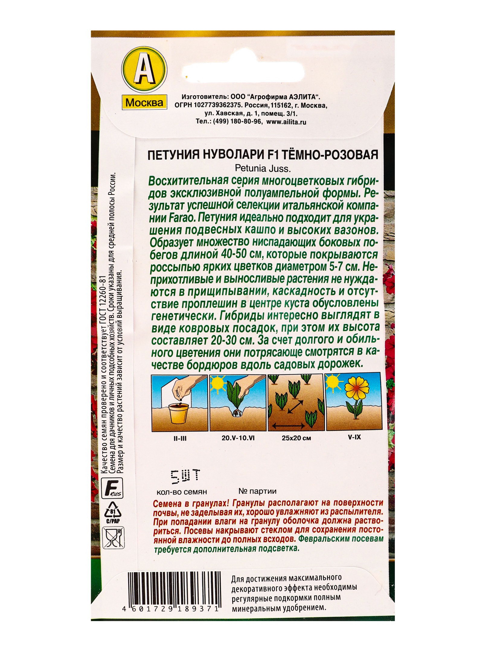 Семена цветов Петуния "Нуволари", F1, полуампельная, тёмно-розовая, драже, Farao, 5 шт., Агрофирма АЭЛИТА, Россия