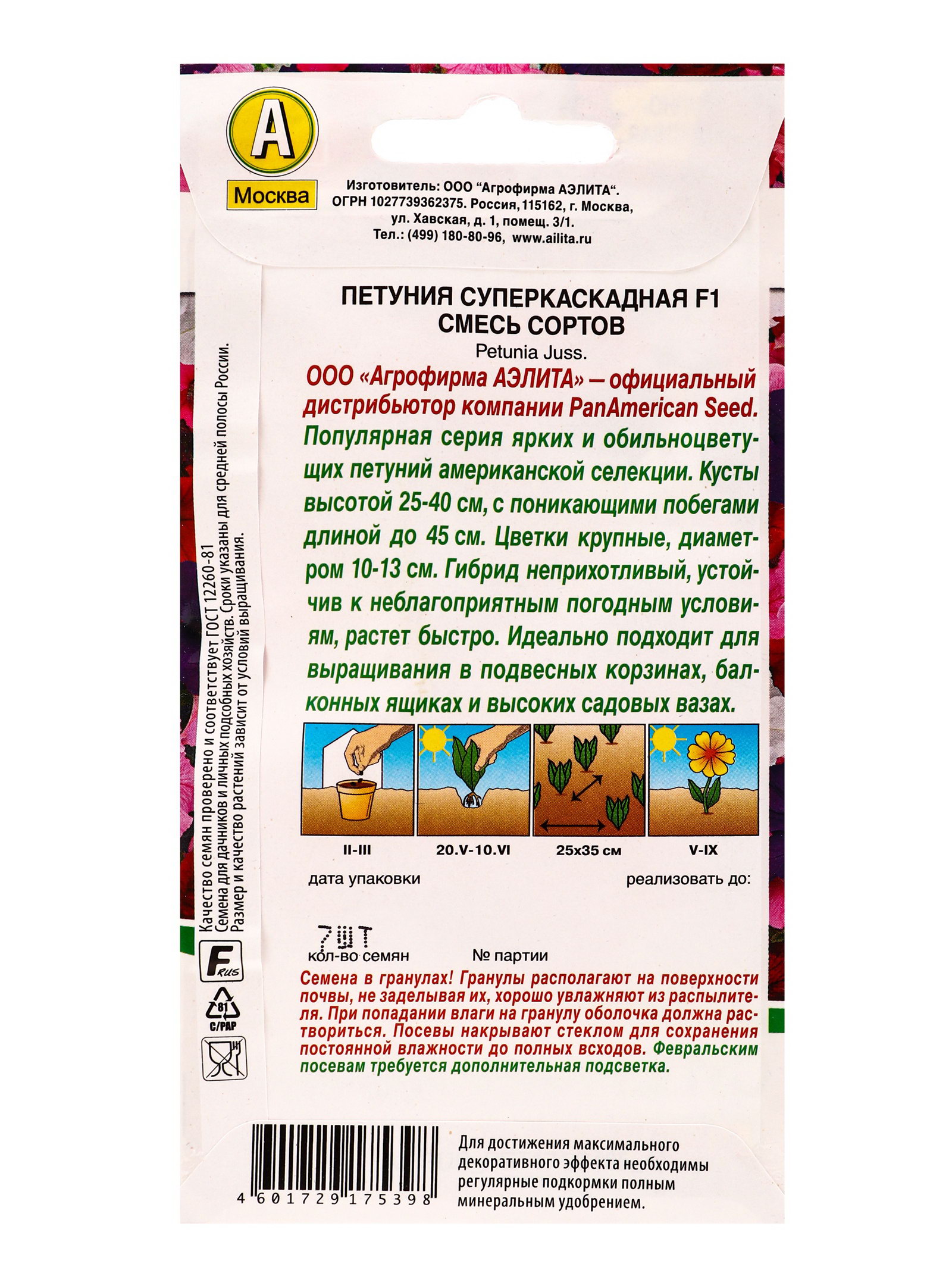 Семена цветов Петуния "Суперкаскадная", F1, смесь сортов, драже, PanAmerican, 7 шт., Агрофирма АЭЛИТА, Россия