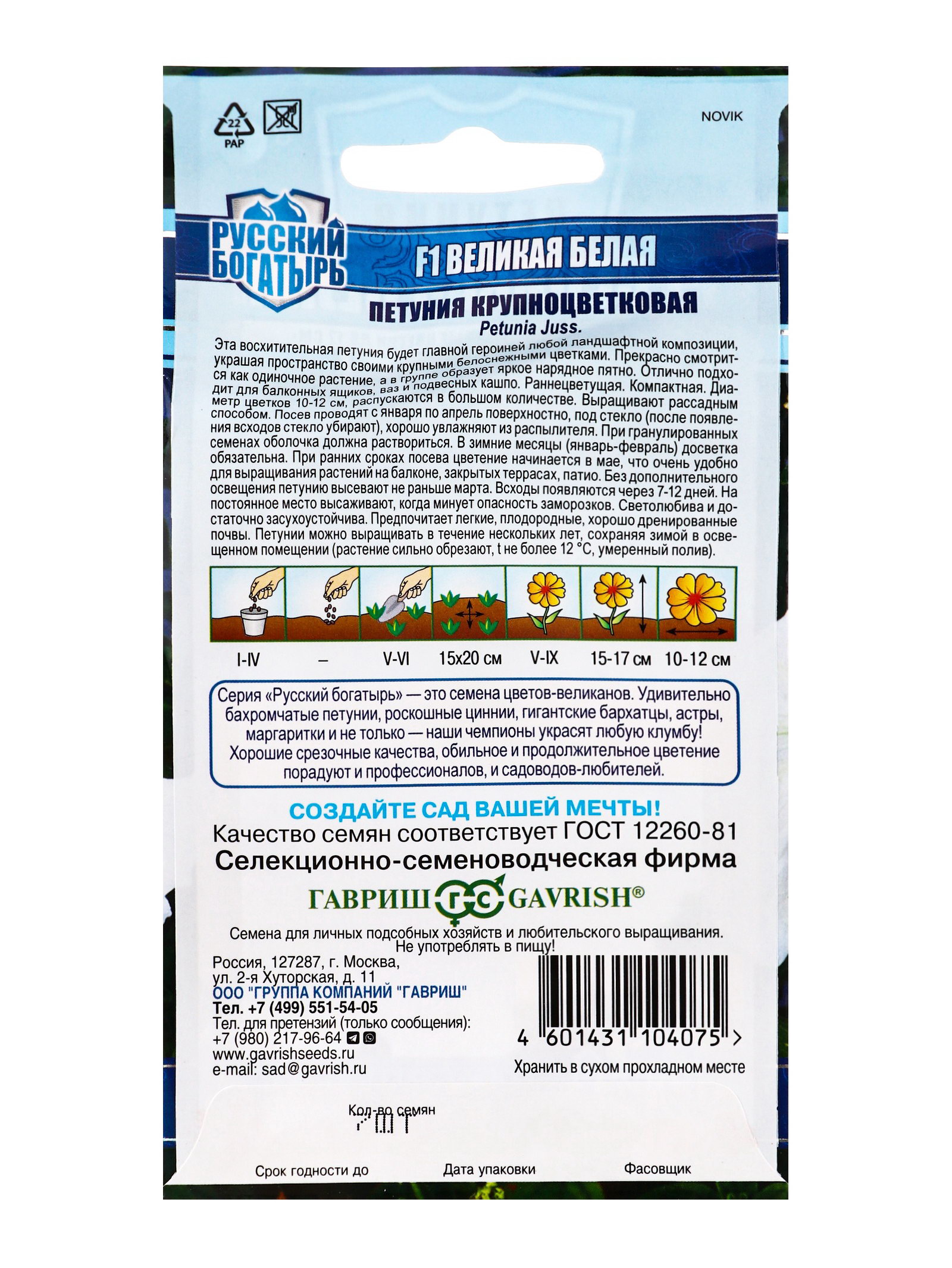 Семена цветов Петуния Великая белая F1, крупноцветковая 7 шт. гранул. пробирка, серия Русский богатырь 109, Гавриш, Россия