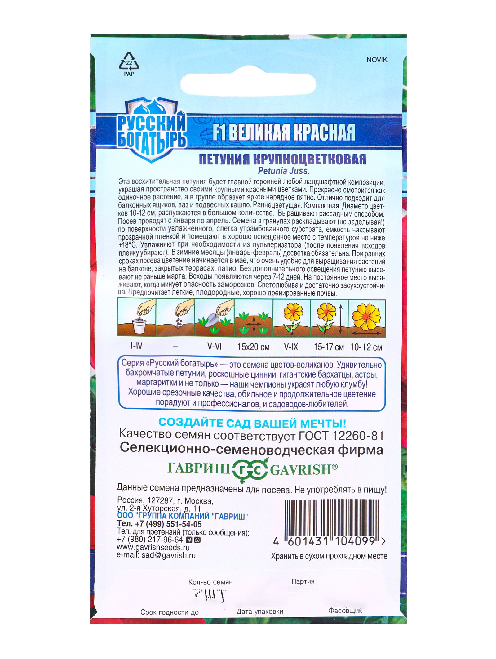 Семена цветов Петуния Великая красная F1, крупноцветковая 7 шт. гранул. пробирка, серия Русский богатырь 1, Гавриш, Россия