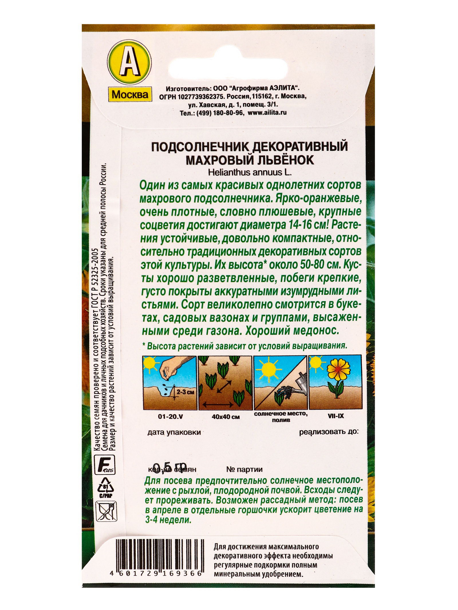 Семена цветов Подсолнечник Махровый Львенок Золотая серия, Ц/П,0.5 г, Агрофирма АЭЛИТА, Нидерланды