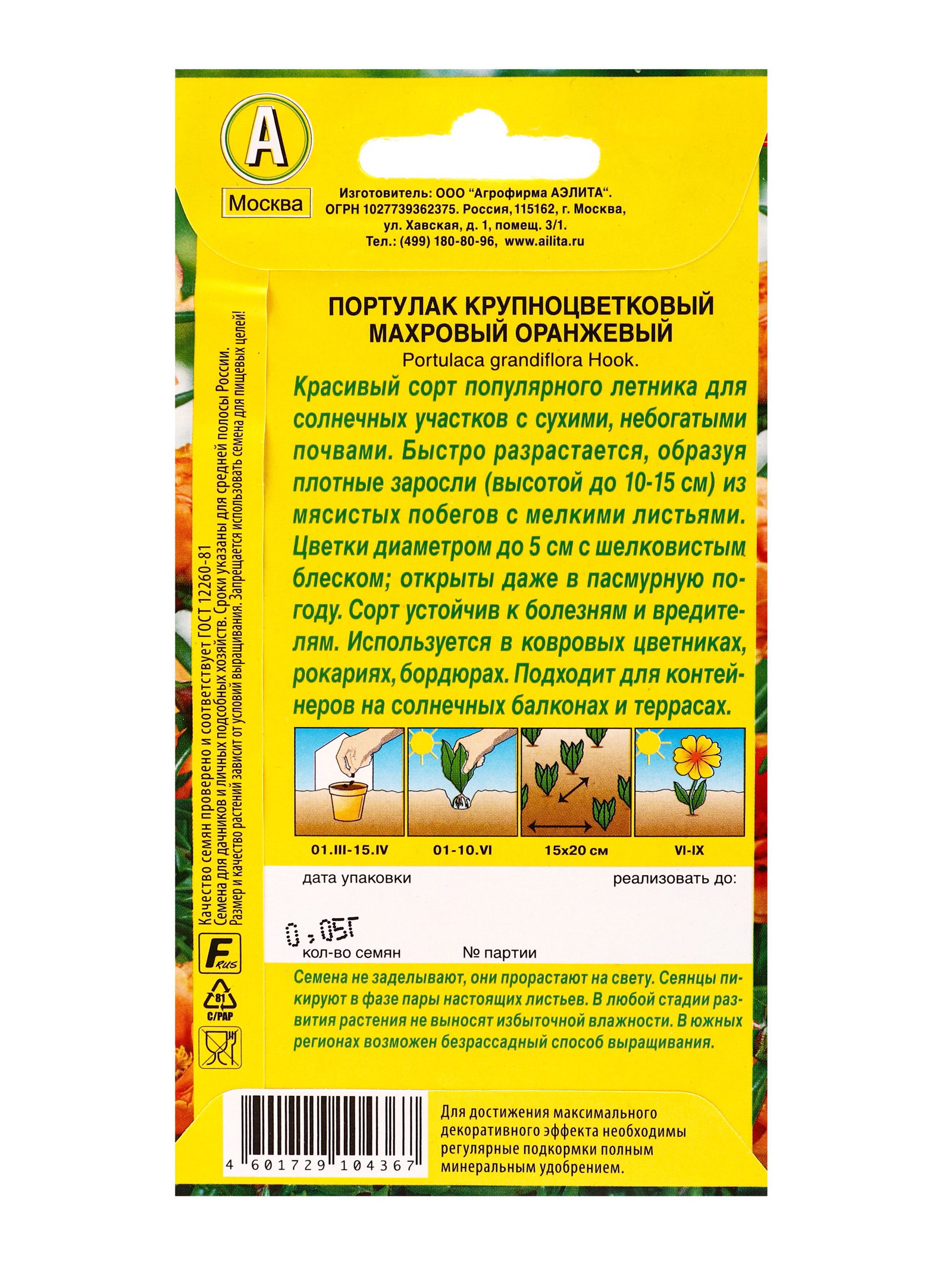 Семена цветов Портулак махровый оранжевый, Ц/П,0.05 г, Агрофирма АЭЛИТА, Нидерланды