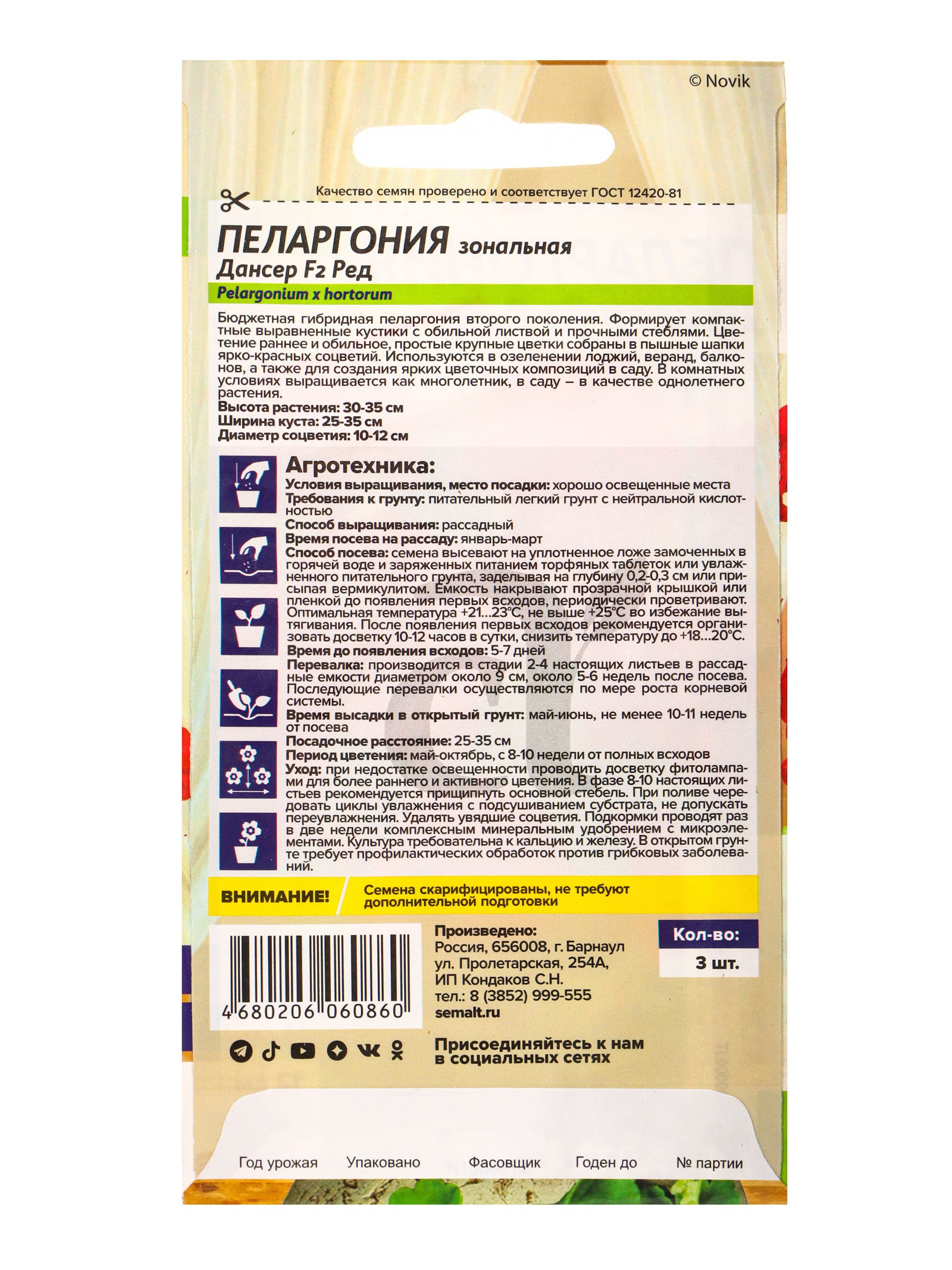 Семена цветов Пеларгония "Дансер Ред", зональная, 3 шт., Семена Алтая, Россия