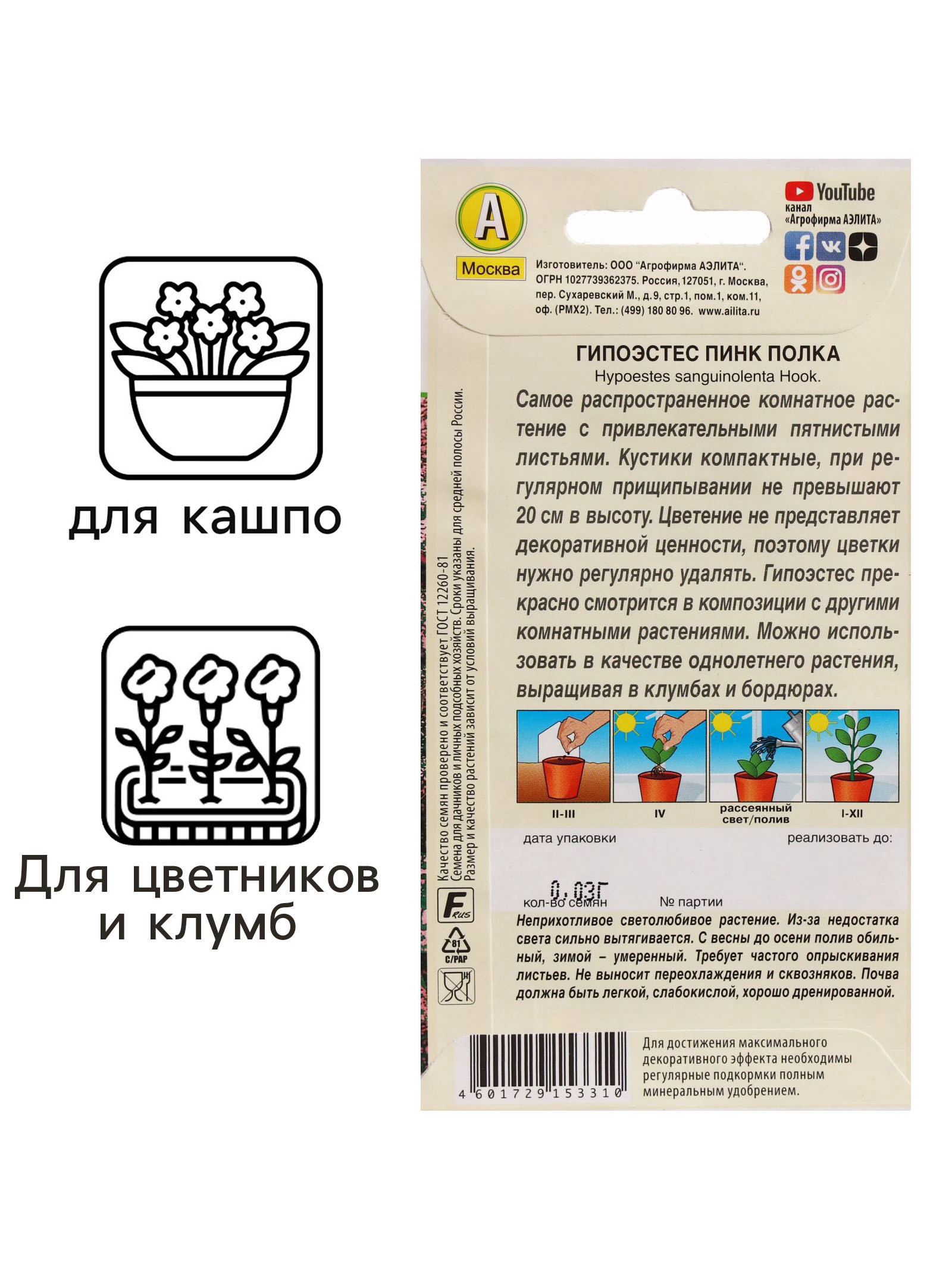 Размер упаковки: 8 x 0.2 x 15 см. Сухоцвет: Нет Особенности выращивания: Открытый грунт Махровые: Нет Вегетация: Однолетники Назначение: Для создания цветников, клумбы По форме куста: Кустовая Отношение к свету: Рассеянный свет Подходит для балкона: Да Разновидность: Цветущее Нуждаются ли в стратификации: Нет tnved: 1209300000 tnved: 1209300000 Температурное ограничение: Нет Агрономический срок годности, лет: 7 Цвет: Разноцветный Вид: Гипоэстес Самое распространенное комнатное растение с привлекательными пятнистыми листьями. Кустики компактные, при регулярном прищипывании не превышают 20 см в высоту. Цветение не представляет декоративной ценности, поэтому цветки нужно регулярно удалять. Гипоэстес прекрасно смотрится в композиции с другими комнатными растениями. Можно использовать в качестве одно летнего растения, выращивая в клумбах и бордюрах. Неприхотливое светолюбивое растение. Из-за недостатка света сильно вытягивается. С весны до осени полив обильный, зимой – умеренный. Требует частого опрыскивания листьев. Не выносит переохлаждения и сквозняков. Почва должна быть легкой, слабокислой, хорошо дренированной. | ||