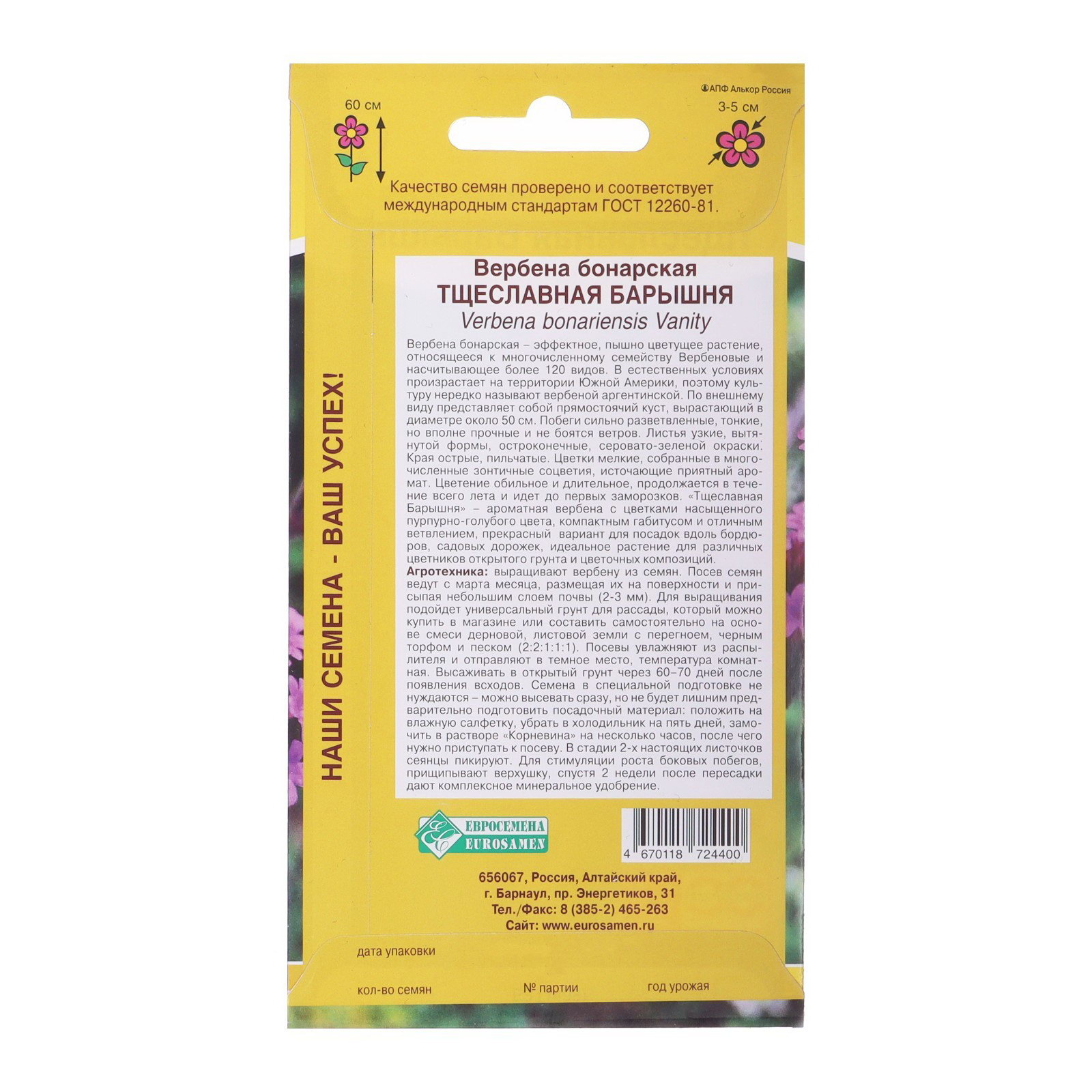 Место выращивания: Открытый грунт, Подоконник, балкон Цветение период: Август, Июль, Июнь, Октябрь, Сентябрь Посев на рассаду: Апрель, Март Посев (посадка) в грунт: Июнь, Май Размер упаковки: 8 x 0.1 x 15 см. Температурное ограничение: Нет Вид: Вербена Цвет: Фиолетовый Сухоцвет: Нет Махровые: Нет tnved: 1209300000 tnved: 1209300000 По форме куста: Кустовая Отношение к свету: Светолюбивые Назначение: Для создания цветников, клумбы Высота растений: 30-60 см Вегетация: Однолетники Нуждаются ли в стратификации: Да Аристократичная красота для вашего сада! Вербена бонарская "Тщеславная Барышня" (5 семян) изысканное однолетнее растение с воздушными фиолетовыми соцветиями. Эффектные кусты украшают сад с начала лета до заморозков.