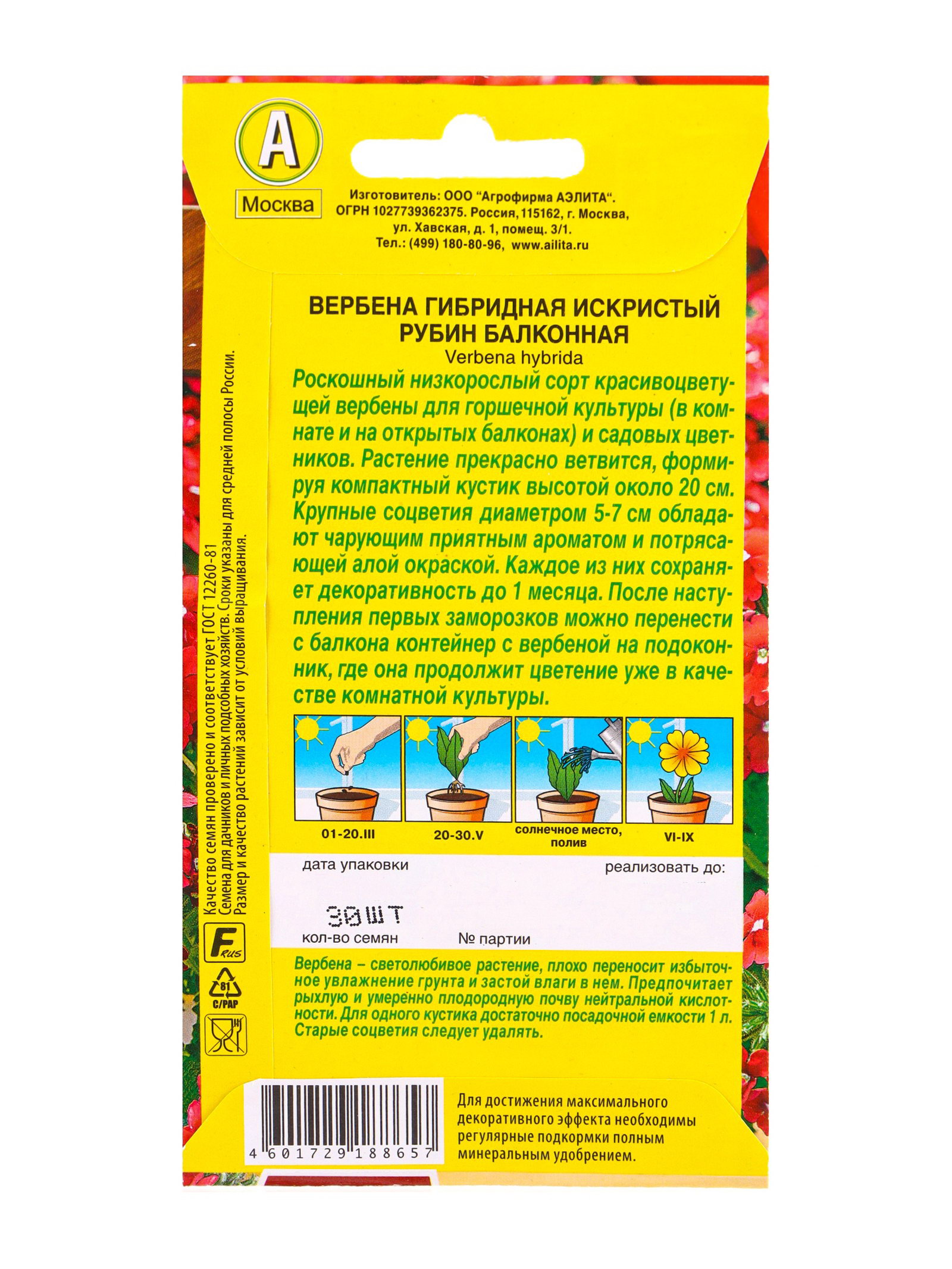 Семена цветов Вербена Искристый рубин балконная Цветущий балкон, Ц/П,30 шт., Агрофирма АЭЛИТА, Нидерланды