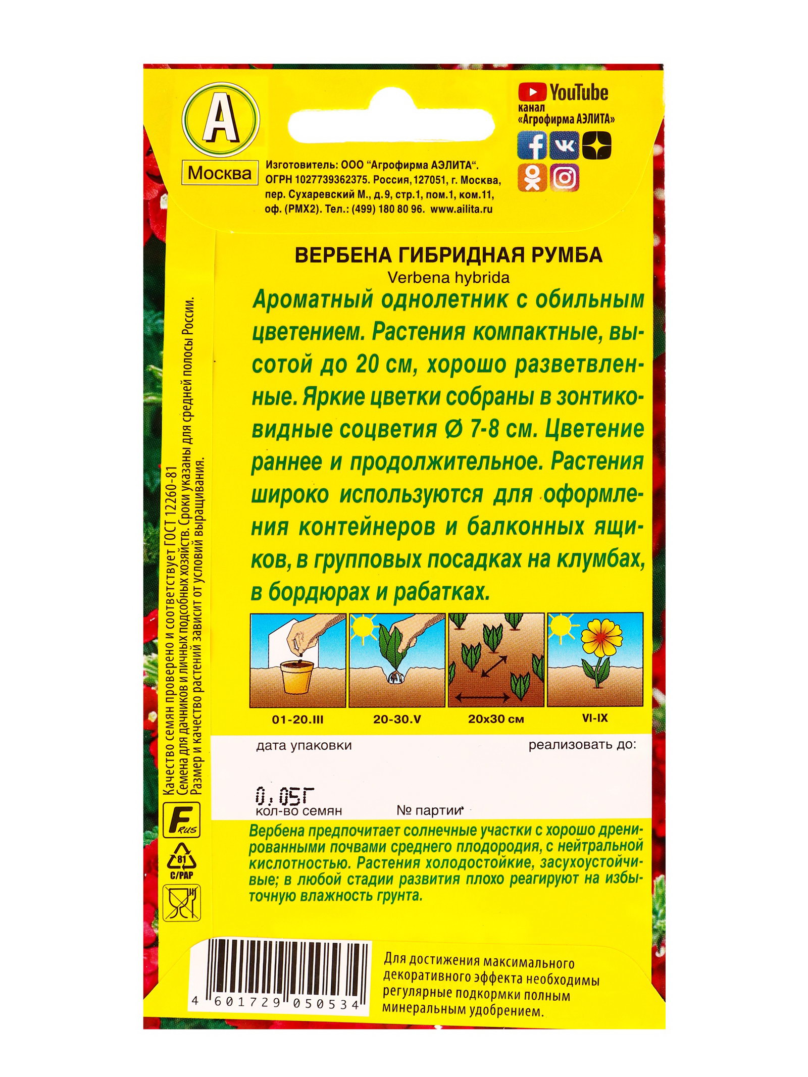 Семена цветов Вербена Румба, Ц/П,0.05 г, Агрофирма АЭЛИТА, Нидерланды