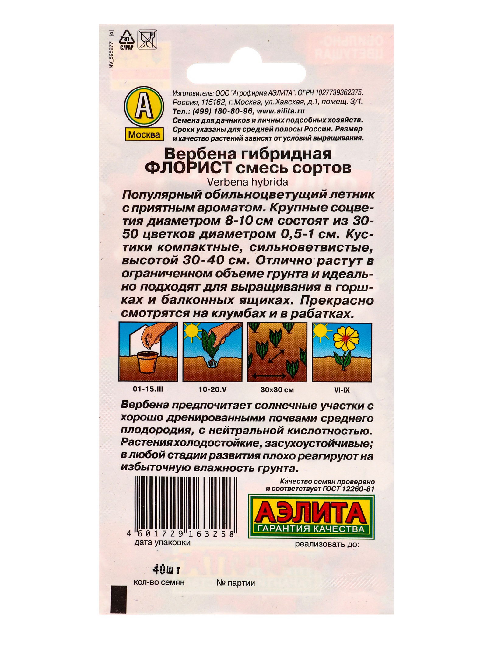 Семена цветов Вербена Флорист, смесь сортов, Ц/П,40 шт., Агрофирма АЭЛИТА, Нидерланды